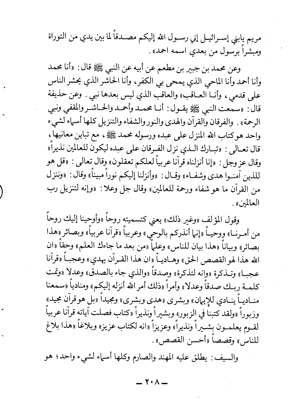 وعن محمد بن جبير بن مطعم عن أبيه عن النبي صلى الله عليه وسلم قال: "أنا محمد وأنا أحمد وأنا الماحي الذي يمحى بي الكفر، وأنا الحاشر الذي يحشر الناس على قدمي، وأنا العاقب" والعاقب الذي ليس بعده نبي. وعن حذيفة قال: "سمعت النبي صلى الله عليه وسلم يقول: "أنا محمد وأحمد والحاشر والمقفي ونبي الرحمة". والفرقان والقرآن والهدى والنور والشفاء والتنزيل كلها أسماء لشيء واحد هو كتاب الله المنزل على عبده ورسوله محمد صلى الله عليه وسلم، مع تبلين معانيها، قال تعالى: {تَبَارَكَ الَّذِي نَزَّلَ الْفُرْقَان عَلَى عَبْدِهِ لِيَكُونَ لِلْعَالَمِينَ نَذِيراً} وقال عز وجل: {أنا أنزَلْنَاهُ قُرْأناً عَرَبِيا لَعَلَّكُمْ تَعْقِلُونَ} وقال: {قُلْ هُوَ لِلَّذِينَ آمَنُوا هُدىً وَشِفَاءٌ} وقال: {وَأنزَلْنَا إِلَيْكُمْ نُوراً مُبِيناً} وقال: {وَنُنَزِّلُ مِنَ القرآن مَا هُوَ شِفَاءٌ وَرَحْمَةٌ لِلْمُؤْمِنِينَ} وقال: {وَأنهُ لَتَنْزِيلُ رَبِّ الْعَالَمِينَ} .