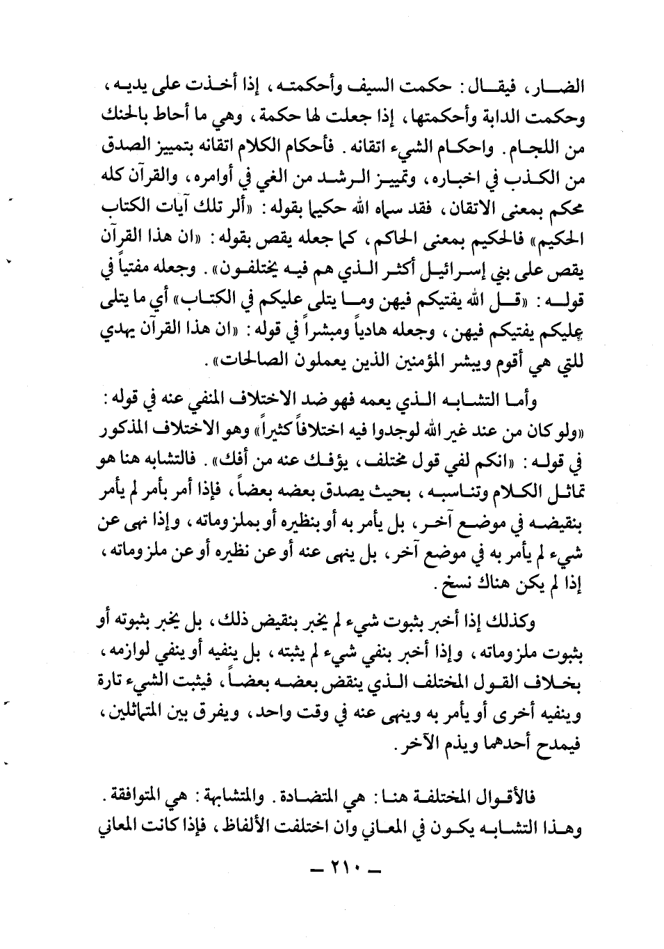 وأما التشابه الذي يعمه فهو ضد الاختلاف المنفي عنه في قوله: {وَلَوْ كان مِنْ عِنْدِ غَيْرِ اللَّهِ لَوَجَدُوا فِيهِ اخْتِلافاً كَثِيراً} وهو الاختلاف المذكور في قوله: {أنكُمْ لَفِي قَوْلٍ مُخْتَلِفٍ يُؤْفَكُ عَنْهُ مَنْ أُفِكَ} . فالتشابه هنا هو تماثل الكلام وتناسبه، بحيث يصدق بعضه بعضاً، فإذا أمر بأمر لم يأمر بنقيضه في موضع آخر، بل يأمر به أو بنظيره أو بملزوماته، وإذا نهى عن شيء لم يأمر به في موضع آخر، بل ينهى عنه أو عن نظيره أو عن ملزوماته، إذا لم يكن هناك نسخ.