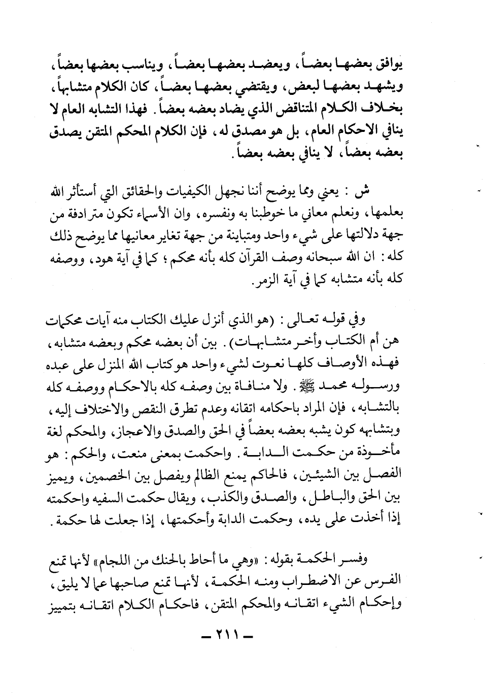 وفي قوله تعالى: {هُوَ الَّذِي أنزَلَ عَلَيْكَ الْكِتابَ مِنْهُ آيات مُحْكَمَاتٌ هُنَّ أُمُّ الْكِتابِ وَأُخَرُ مُتَشَابِهَاتٌ} بين أن بعضه محكم وبعضه متشابه، فهذه الأوصاف كلها نعوت لشيء واحد هو كتاب الله المنزل على عبده ورسوله محمد صلى الله عليه وسلم. ولا منافاة بين وصفه كله بالإحكام ووصفه كله بالتشابه، فإن المراد بإحكامه إتقانه وعدم تطرق النقص والاختلاف إليه، وبتشابهه كون يشبه بعضه بعضاً في الحق والصدق والإعجاز، والمحكم لغة مأخوذة من حكمت الدابة. وأحكمت بمعنى منعت، والحكم: هو الفصل بين الشيئين، فالحاكم يمنع الظالم ويفصل بين الخصمين، ويميز بين الحق والباطل، والصدق والكذب، ويقال حكمت السفيه وأحكمته إذا أخذت على يده، وحكمت الدابة وأحكمتها، إذا جعلت لها حكمة.