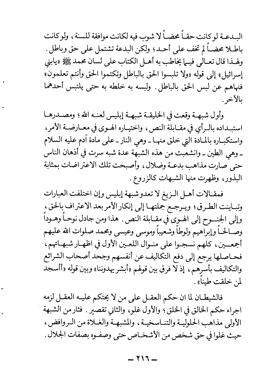 فالشيطان لما أن حكم العقل على من لا يحتكم عليه العقل لزم إجراء حكم الخالق في الخلق، والأول غلو، والثاني تقصير. فثار من الشبهة الأولى مذاهب الحلولية والتناسخية، والمشبهة والغلاة من الروافض