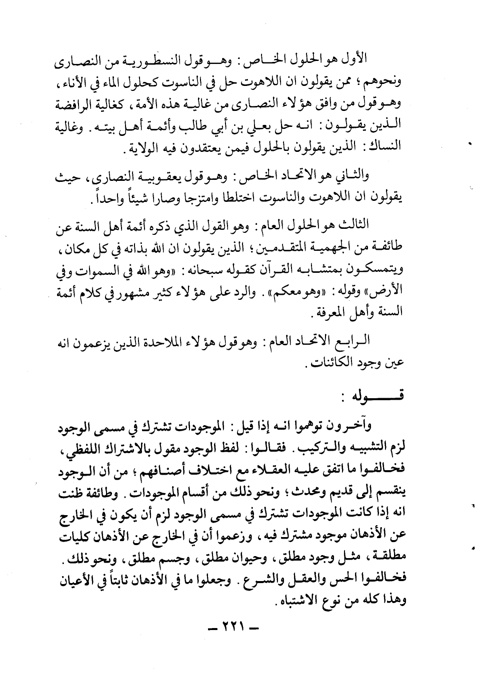 قوله: وآخرون توهموا أنه إذا قيل: الموجودات تشترك في مسمى الوجود لزم التشبيه والتركيب. فقالوا: لفظ الوجود مقول بالاشتراك اللفظي، فخالفوا ما اتفق عليه العقلاء مع اختلاف أصنافهم، من أن الوجود ينقسم إلى قديم ومحدث، ونحو ذلك من أقسام الموجودات. وطائفة ظنت أنه إذا كانت الموجودات تشترك في مسمى الوجود لزم أن يكون في الخارج عن الأذهان موجود مشترك فيه، وزعموا أن في الخارج عن الأذهان كليات مطلقة، مثل وبود مطلق، وحيوان مطلق، وجسم مطلق، ونحو ذلك فخالفوا الحس والعقل والشرع. وجعلوا ما في الأذهان ثابتا في الأعيان وهذا كله من نوع الاشتباه.