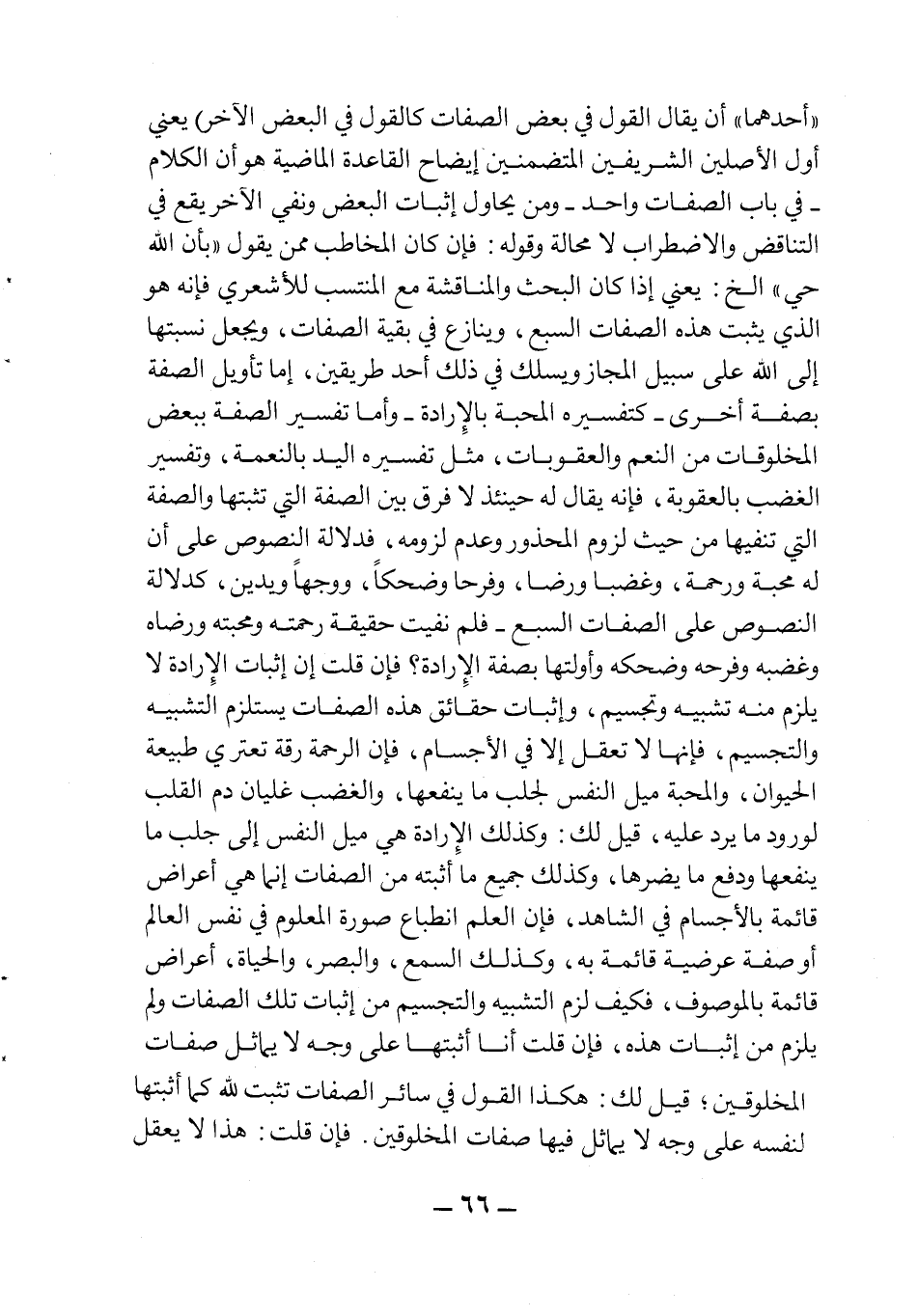 "أحدهما" أن يقال القول في بعض الصفات كالقول في البعض الآخر" يعني أول الأصلين الشريفين المتضمنين إيضاح القاعدة الماضية هو أن الكلام –في باب الصفات واحد- ومن يحاول إثبات البعض ونفي الآخر يقع في التناقض والاضطراب لا محالة وقوله: فإن كان المخاطب ممن يقول"بأن الله حي" الخ: يعني إذا كان البحث والمناقشة مع المنتسب للأشعري فإنه هو الذي يثبت هذه الصفات السبع، وينازع في بقية الصفات، ويجعل نسبتها إلى الله على سبيل المجاز ويسلك في ذلك أحد طريقين، إما تأويل الصفة بصفة أخرى-كتفسيره المحبة بالإرادة- وإما تفسير الصفة ببعض المخلوقات من النعم والعقوبات، مثل تفسيره اليد بالنعمة، وتفسير الغضب بالعقوبة، فإنه يقال له حينئذ لا فرق بين الصفة التي تثبتها والصفة التي تنفيها من حيث لزوم المحذور وعدم لزومه، فدلالة النصوص على أن له محبة ورحمة، وغضبا ورضا، وفرحاً وضحكاً، ووجهاً ويدين، كدلالة النصوص على الصفات السبع-فلم نفيت حقيقة رحمته ومحبته ورضاه وغضبه وفرحه وضحكه وأولتها بصفة الإرادة؟ فإن قلت إن إثبات الإرادة لا يلزم منه تشبيه وتجسيم، وإثبات حقائق هذه الصفات يستلزم التشبيه والتجسيم، فإنها لا تعقل إلا في الأجسام، فإن الرحمة رقة تعتري طبيعة الحيوان، والمحبة ميل النفس لجلب ما ينفعها، والغضب غليان دم القلب لورود ما يرد عليه، قيل لك: وكذلك الإرادة هي ميل النفس إلى جلب ما ينفعها ودفع ما يضرها، وكذلك جميع ما أثبته من الصفات إنما هي أعراض قائمة بالأجسام في الشاهد فإن العلم انطباع صورة المعلوم في العالم أو صفة عرضية قائمة به وكذلك السمع والبصر والحياة أعراض قائمة بالموصوف، فكيف لزم التشبيه والتجسيم من إثبات تلك الصفات ولم يلزم من إثبات هذه، فإن قلت أنا أثبتها على وجه لا يماثل صفات المخلوقين، قيل لك: هكذا القول في سائر الصفات تثبت لله كما أثبتها لنفسه على وجه لا يماثل فيها صفات المخلوقين. فإن قلت: هذا لا يعقل
