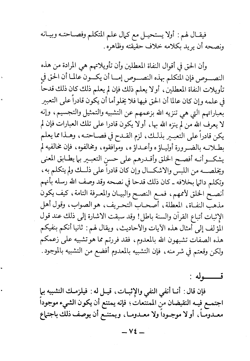 وأن الحق في أقوال النفاة المعطلين وأن تأويلاتهم هي المرادة من هذه النصوص فإن المتكلم بهذه النصوص أما أن يكون عالما أن الحق في تأويلات النفاة المعطلين، أولا يعلم ذلك فإن لم يعلم ذلك كان ذلك قدحاً في علمه وإن كان عالما أن الحق فيها فلا يخلو أما أن يكون قادراًَ على التعبير بعباراتهم التي هي تنزيه الله بزعمهم عن التشبيه والتمثيل والتجسيم، وأنه لا يعرف الله من لم ينزه اله بها، أو لا يكون قادرا على تلك العبارات فإن لم يكن قادراً على التعبير بذلك، لزم القدح في فصاحته، وهذا مما يعلم بطلانه بالضرورة أولياؤه وأعداؤه، وموافقوه، ومخالفوه، فإن مخالفيه لم يشكو أنه أفصح الخلق وأقدرهم على حسن التعبير بما يطابق المعنى ويخلصه من اللبس والإشكال وإن كان قادراً على ذلك ولم يتكلم به، وتكلم دائما بخلافه كان ذلك قدحا في نصحه وقد وصف الله رسله بأنهم أنصح الخلق لأممهم، فمع النصح والبيان والمعرفة التامة، كيف يكون مذهب النفاة، المعطلة، أصحاب التحريف، هو الصواب، وقول أهل الإثبات أتباع القرآن والسنة باطل، وقد سبقت الإشارة إلى ذلك عند قول المؤلف إلى أمثال هذه الآيات والأحاديث، ويقال لهم: ثانيا إنكم بنفيكم هذه الصفات تشبهون الله بالمعدوم، فقد فررتم مما هو تشبيه على زعمكم ولكن وقعتم في شر منه، فإن التشبيه بالمعدوم أفظع من التشبيه بالموجود.