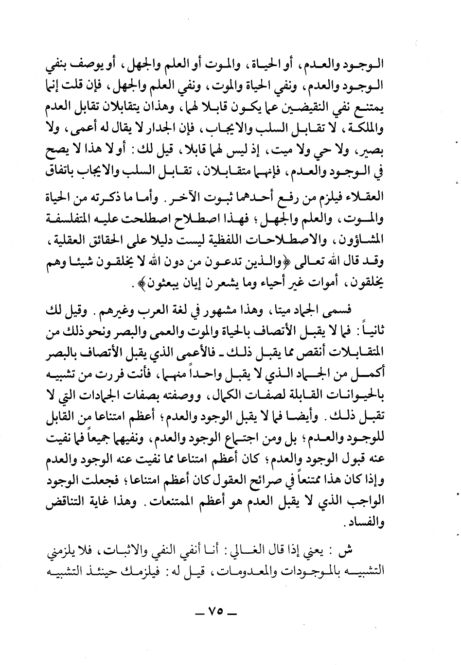 الوجود والعدم، أو الحياة والموت، أو العلم والجهل، أو يوصف بنفي الوجود والعدم، ونفي الحياة والموت، ونفي العلم والجهل، فإن قلت إنما يمتنع نفي النقيضين عما يكون قابلا لهما، وهذان يتقابلان تقابل العدم والملكة، لا تقابل السلب والإيجاب، فإن الجدار لا يقال له أعمى، ولا بصير، ولا حي ولا ميت، إذ ليس لهما قابلا، قيل لك: أولا هذا لا يصح في الوجود والعدم، فإنهما متقابلان، تقابل السلب والإيجاب باتفاق العقلاء فيلزم من رفع أحدهما ثبوت الآخر. وأما ما ذكرته من الحياة والموت، والعلم والجهل، فهذا اصطلاح اصطلحت عليه المتفلسفة المشاؤون، والاصطلاحات اللفظية ليست دليلا على الحقائق العقلية، وقد قال تعالى {وَالَّذِينَ يَدْعُونَ مِنْ دُونِ اللَّهِ لا يَخْلُقُونَ شَيْئاً وَهُمْ يُخْلَقُونَ أَمْوَاتٌ غَيْرُ أَحْياءٍ وَمَا يَشْعُرُونَ أيان يُبْعَثُونَ} .