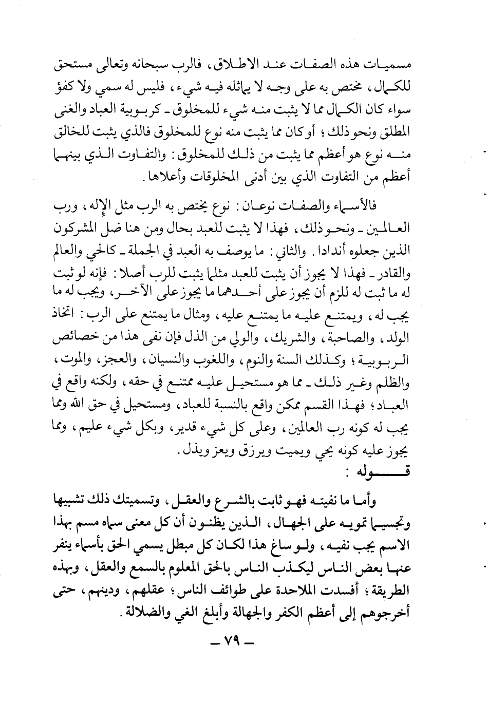 وأما ما نفيته فهو ثابت بالشرع والعقل، وتسميتك ذلك تشبيها وتجسيما تمويه على الجهال، الذين يظنون أن كل معنى سماه مسم بهذا الاسم يجب نفيه، ولو ساغ هذا لكان كل مبطل يسمى الحق بأسماء ينفر عنها بعض الناس ليكذب الناس بالحق المعلوم بالسمع والعقل، وبهذه الطريقة أفسدت الملاحدة على طوائف الناس، عقلهم، ودينهم، حتى أخرجوهم إلى الكفر والجهالة وأبلغ الغي والضلالة.