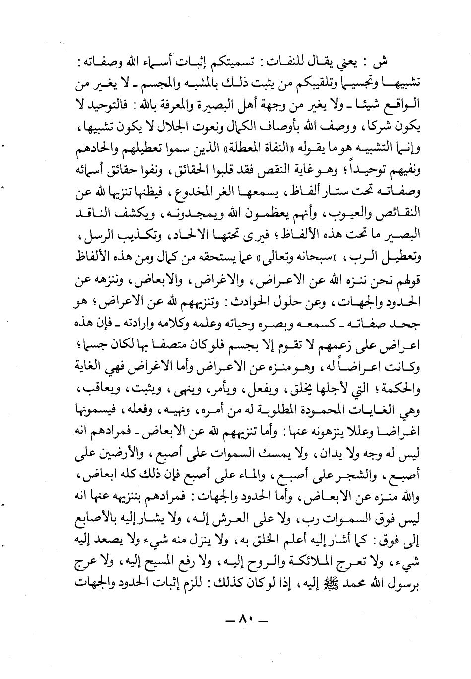 ش: يعني يقال للنفات: تسميتكم إثبات أسماء الله وصفاته: تشبيها وتجسيما وتلقيبكم من يثبت ذلك بالمشبه والمجسم لا يغير من الواقع شيئا ولا يغير من وجهة أهل البصيرة والمعرفة بالله: فالتوحيد لا يكون شركا، ووصف الله بأوصاف الكمال ونعوت الجلال لا يكون تشبيها، وإنما التشبيه هو ما يقوله "النفاة المعطلة" الذين سموا تعطيلهم وإلحادهم ونفيهم توحيداً، وهو غاية النقص فقد قلبوا الحقائق، ونفوا حقائق أسمائه وصفاته تحت ستار ألفاظ، يسمعها الغر المخدوع، فيظنها تنزيها لله عن النقائص والعيوب، وأنهم يعظمون الله ويمجدونه، ويكشف الناقد البصير ما تحت هذه الألفاظ، فيرى تحتها الإلحاد، وتكذيب الرسل، وتعطيل الرب، سبحانه وتعالى عما يستحقه من كمال ومن هذه الألفاظ قولهم نحن ننزه الله عن الإعراض، والأغراض، والأبعاض، وننزهه عن الحدود والجهات، وعن حلول الحوادث، وتنزيهم لله عن الإعراض، هو جحد صفاته-كسمعه وبصره وحياته وعلمه وكلامه وإرادته- فإن هذه أعراض على زعمهم لا تقوم إلا بجسم فلو كان متصفا بها لكان جسما، وكانت إعراضاً له، وهو منزه عن الإعراض وأما الأغراض فهي الغاية والحكمة، التي لأجلها يخلق، ويأمر، وينهى، ويثبت، ويعاقب، وهي الغايات المحمودة المطلوبة له من أمره، ونهيه، وفعله، فيسمونها أغراضا وعللا ينزهونه عنها وأما تنزيهم لله عن الأبعاض فمرادهم أنه ليس له وجه ولا يدان، ولا يمسك السموات على إصبع، والأرضين على إصبع، والشجر على إصبع، والماء على إصبع، فإن ذلك كله ابعاض، والله منزه عن الابعاض، وأما الحدود والجهات فمرادهم بتنزيهه عنها أنه ليس فوق السموات رب، ولا على العرش اله، ولا يشار إليه بالأصابع إلى فوق كما أشار إليه أعلم الخلق به، ولا ينزل منه شيء ولا يصعد إليه شيء، ولا تعرج الملائكة والروح إليه، ولا رفع المسيح إليه، ولا عرج برسول الله محمد صلى الله عليه وسلم إليه، إذا لو كان كذلك للزم إثبات الحدود والجهات