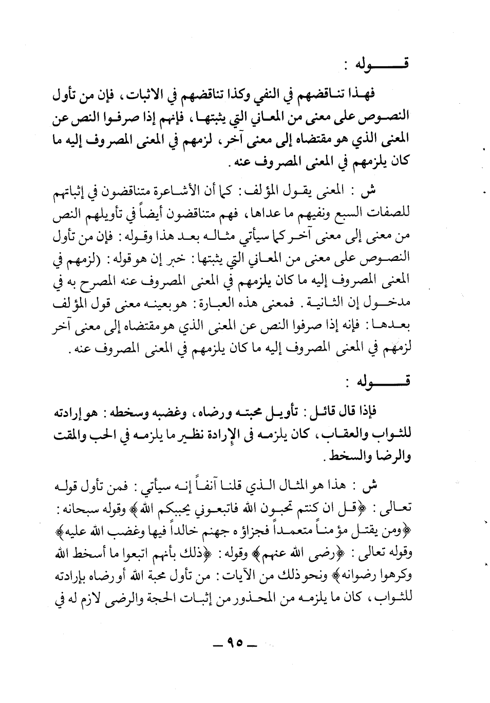 ش: هذا هو المثال الذي قلنا أنفا إنه سيَأتِي: فمن تأويله قوله تعالى: {قُلْ أن كُنْتُمْ تُحِبُّونَ اللَّهَ فَاتَّبِعُونِي يُحْبِبْكُمُ اللَّه} وقوله سبحانه: {وَمَنْ يَقْتُلْ مُؤْمِناً مُتَعَمِّداً فَجَزَاؤُهُ جَهَنَّمُ خَالِداً فِيهَا وَغَضِبَ اللَّهُ عَلَيْهِ} وقوله تعالى: {رَضِيَ اللَّهُ عَنْهُمْ} وقوله: {ذَلِكَ بِأنهُمُ اتَّبَعُوا مَا أَسْخَطَ اللَّهَ وَكَرِهُوا رِضْوَانهُ} ونحو ذلك من الآيات من تأول محبة الله أو رضاه بإرادته للثواب، كان ما يلزمه من المحذور من إثبات الحجة والرضى لازم له في