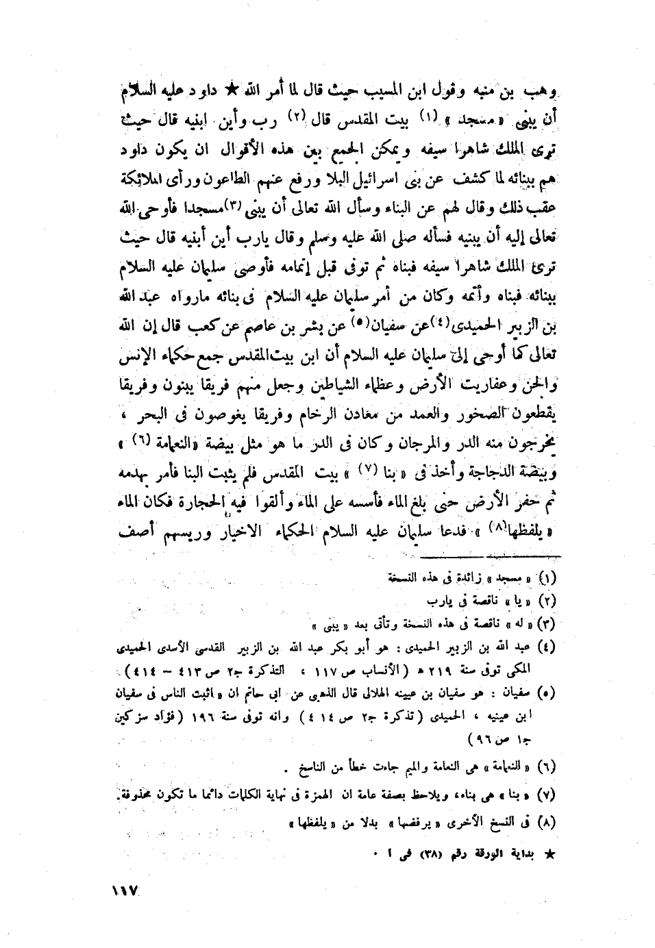 وقول ابن المسيب حيث قال لما أمر اللَّه داود عليه السلام: أن يبني مسجد بيت المقدس قال: رب وأين أبنيه؟ قال: حيث ترى الملك شاهرا سيفه ويمكن الجمع بين هذه الأقوال أن يكون داود هَمَّ ببنائه لما كشف عن بني إسرائيل البلاء ورفع عنهم الطاعون ورأى الملائكة عقب ذلك وقال لهم عن البناء وسأل اللَّه تعالى أن يبني مسجدا. فأوحى اللَّه تعالى إليه أن يبنيه فسأله -صلى اللَّه عليه وسلم- وقال: يا رب أين أبنيه؟ قال حيث ترى الملك شاهرا سيفه فبناه ثم توفي قبل إتمامه فأوصى سليمان -عليه السلام- ببنائه فبناه وأتمه.