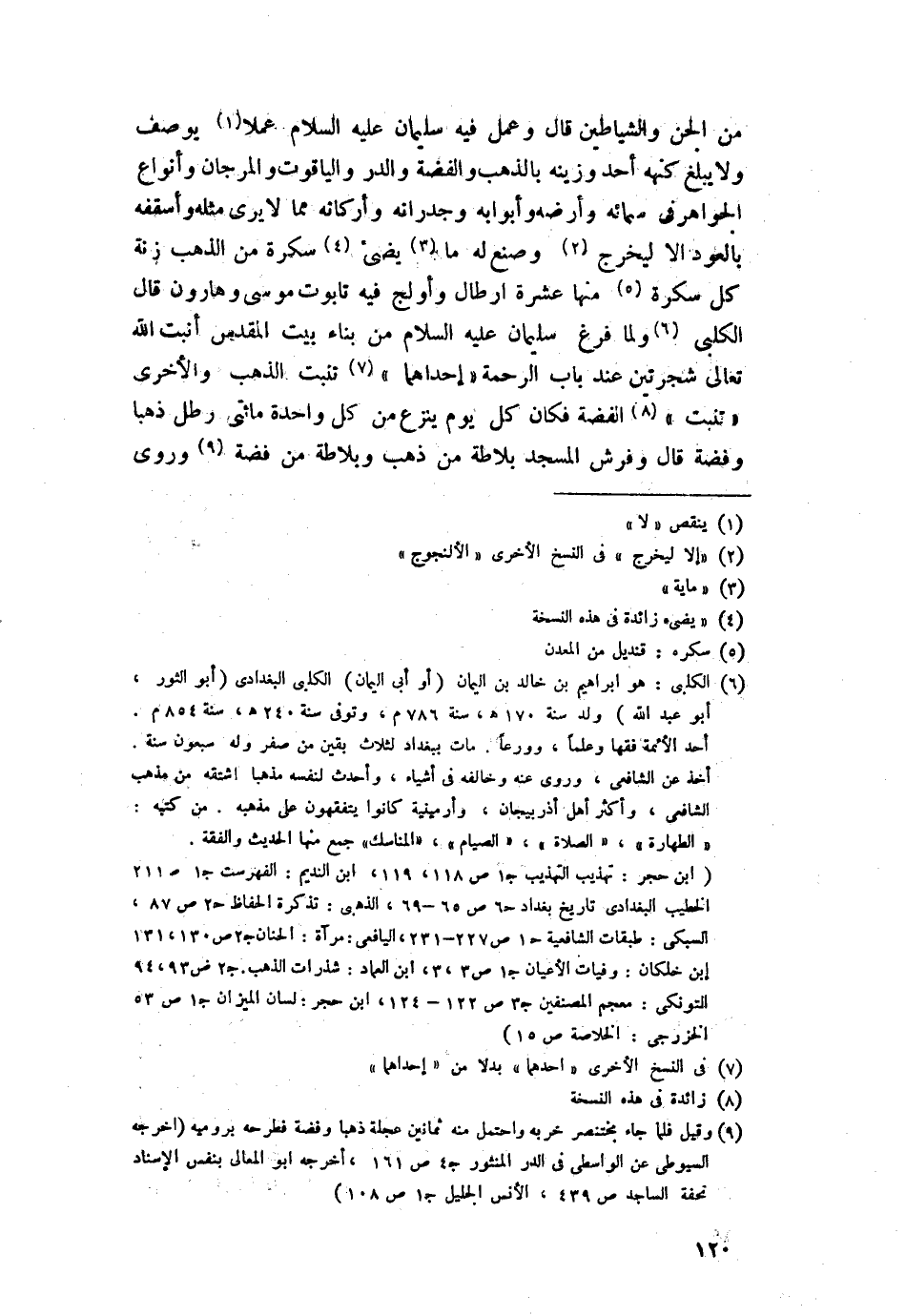 من الجن والشياطين، قال: وعمل فيه سليمان -عليه السلام- عملا يوصف ولا يبلغ كنهه أحد وزينه بالذهب والفضة والدر والياقوت والمرجان وأنواع الجواهر في سمائه وأرضه وأبوابه وجدرانه وأركانه، مما لا يرى مثله وأسقفه بالعود إلا ليخرج وصنع له ما يضيء سكرة من الذهب زنة كل سكرة منها عشرة أرطال وأولج فيه تابوت موسى وهارون.