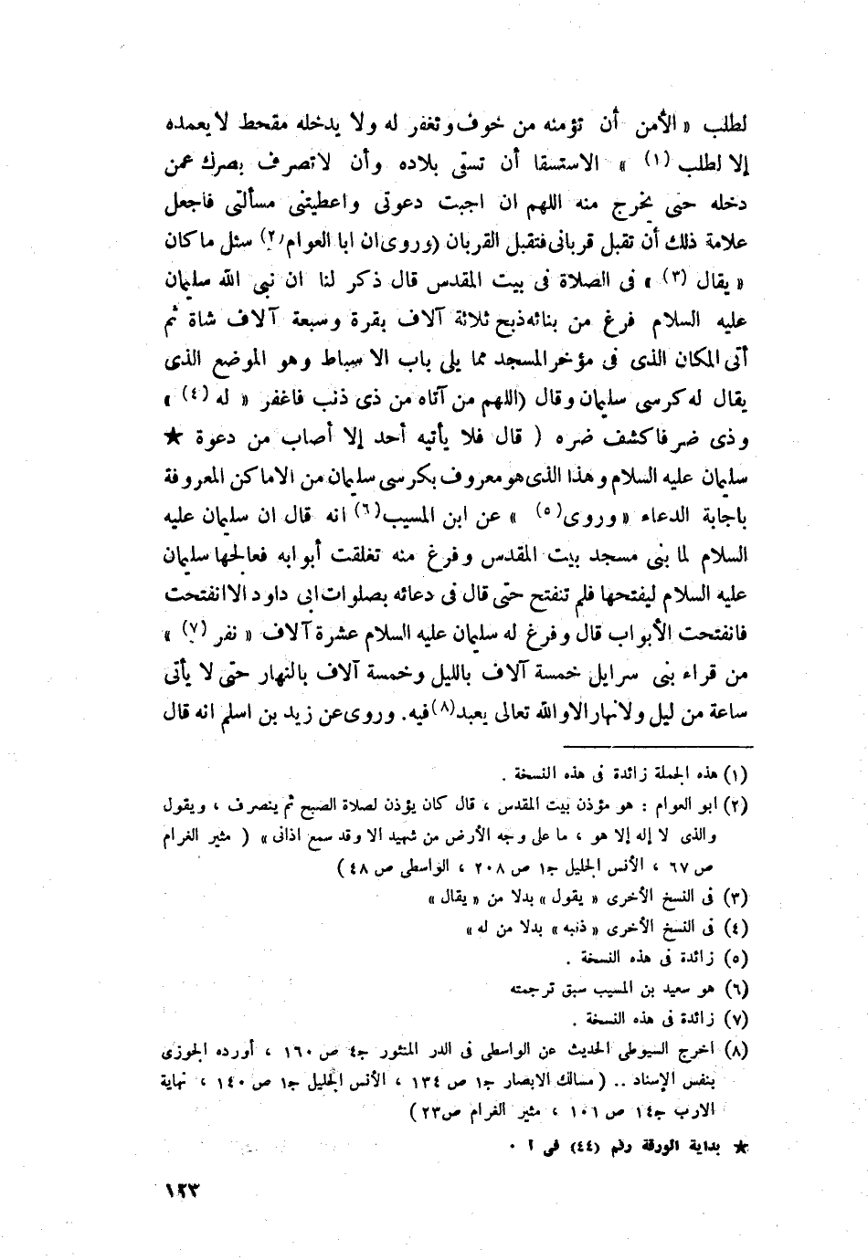 لطلب الأمن أن تؤمنه من خوف وتغفر له ولا يدخله مقحط لا يعمده إلا لطلب الاستسقاء أن تسقي بلاده وأن لا تصرف بصرك عمن دخله حتى يخرج منه اللهم إن أجبت دعوتي وأعطيتني مسألتي فاجعل علامة ذلك أن تقبل قرباني فتقبل القربان (وروي أن أبا العوام سئل ما كان "يقال" في الصلاة في بيت المقدس قال ذكر لنا أن نبي اللَّه سليمان -عليه السلام- لمَّا فرغ من بنائه ذبح ثلاثة آلاف بقرة وسبعة آلاف شاة ثم أتى المكان الذي في مؤخر المسجد مما يلي باب الأسباط وهو الموضع الذي يقال له كرسي سليمان وقال: "اللهم من آتاه من ذي ذنب فاغفر له" وذي ضرٍ فاكشف ضره "قال فلا يأتيه أحد إلا أصاب من دعوة سليمان -عليه السلام- وهذا الذي هو معروف بكرسي سليمان من الأماكن المعروفة بإجابة الدعاء.