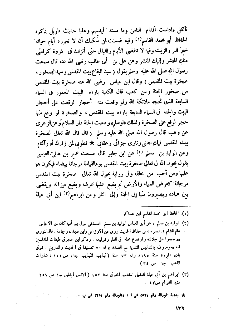 وعن علي بن أبي طالب -رضي اللَّه عنه- قال سمعت رسول اللَّه -صلى اللَّه عليه وسلم- يقول: "سيد البقاع بيت المقدس وسيد الصخور، صخرة بيت المقدس" وقال ابن عباس -رضي اللَّه عنه-: (صخرة بيت المقدس من صخور الجنة). وعن كعب قال: (الكعبة بإزاء البيت المعمور في السماء السابعة الذي تحجه ملائكة اللَّه ولو وقعت منه أحجار لوقعت على أحجار البيت والجنة في السماء السابعة بإزاء بيت المقدس، والصخرة لو وقع منها حجر لوقع على الصخرة ولذلك "أوسلم" ودعيت الجنة دار السلام وعن الزهري عن وهب قال رسول اللَّه -صلى اللَّه عليه وسلم-: "قال: قال اللَّه تعالى لصخرة بيت المقدس فيك جنتي وناري جزائي وعقابي فطوبى لمن زارك أو رآك" وعن الوليد بن مسلم عن ابن جابر قال سمعت عمير بن هانئ العبسي يقول: "يحول اللَّه تعالى صخرة بيت المقدس يوم القيامة مرجانة بيضاء فيكون هو عليها ومن أحب من خلقه" وفي رواية "يحول اللَّه تعالى صخرة بيت المقدس مرجانة كعرض السماء والأرض ثم يضع عليها عرشه ويضع ميزانه ويقضي بين عباده ويصيرون منها إلى الجنة وإلى النار".