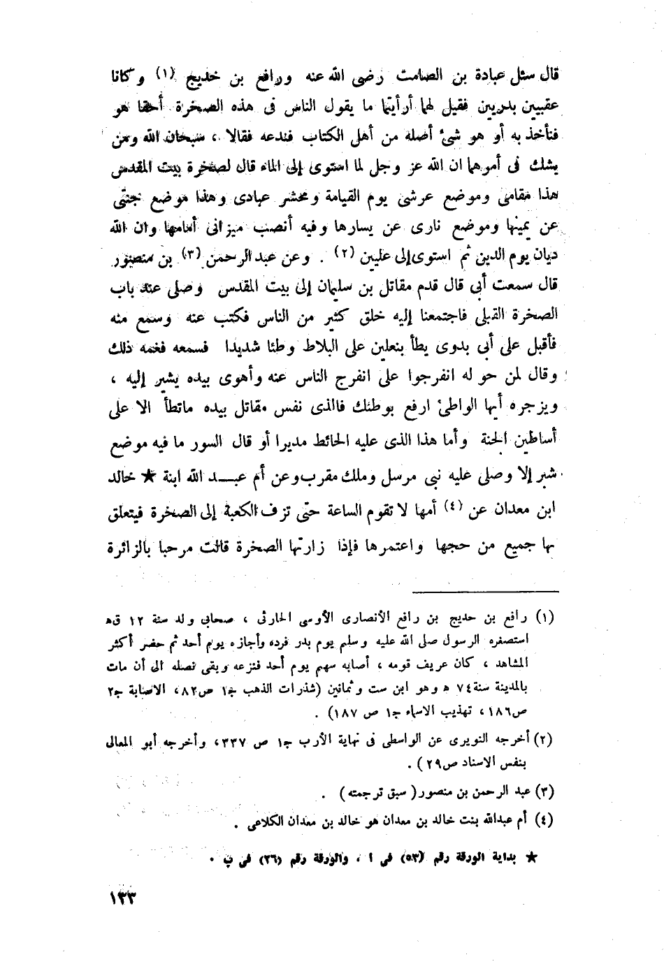 قال: سئل عبادة بن الصامت -رضي اللَّه عنه- ورافع بن خديج وكانا عقبيين بدريين فقيل لهما: أرأيتما ما يقول الناس في هذه الصخرة أحقًّا هو فنأخذ به أو هو شيء أصله من أهل الكتاب فندعه.