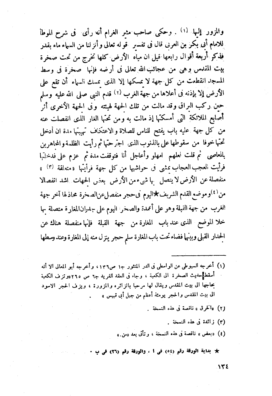 وحكى صاحب مثير الغرام أنه رأى في "شرح الموطأ" للإمام أبي بكر بن العربي قال في تفسير قوله تعالى: {وَأَنْزَلْنَا مِنَ السَّمَاءِ مَاءً بِقَدَرٍ} [المؤمنون: 18] فذكر أربعة أقوال رابعها قيل: إن مياه الأرض كلها تخرج من تحت صخرة بيت المقدس وهي من عجائب اللَّه تعالى في أرضه؛ فإنها صخرة في وسط المسجد انقطعت من كل جهة لا يمسكها إلا الذي يمسك السماء أن تقع على الأرض إلا بإذنه في أعلاها من جهة الغرب قدم النبي -صلى اللَّه عليه وسلم- حين ركب البراق وقد مالت من تلك الجهة لهيئته وفي الجهة الأخرى أثر أصابع الملائكة التي أمسكتها إذ مالت به ومن تحتها الغار الذي انفصلت عنه من كل جهة عليه باب يفتح للناس للصلاة والاعتكاف تهيبتها مدة أن أدخل تحتها خوفا من سقوطها عليّ بالذنوب التى اجترحتها ثم رأيت الظلمة والمجاهرين بالمعاصي ثم قلت لعلهم أمهلوا وأعاجل أنا فتوقفت مدة ثم عزم علي فدخلتها فرأيت العجب العجاب يمشي في حواشيها من كل جهة فرأيتها "متعلقة" منفصلة عن الأرض لا يتصل بها شيء من الأرض بعض الجهات أشد انفصالا من بعض وموضع القدم الشريف اليوم في حجر منفصل عن الصخرة محاذٍ لها آخر جهة الغرب من جهة القبلة وهو على أعمدة والصخرة اليوم على جدران المغارة متصلة بها خلا الموضع الذي عند باب المغارة من جهة القبلة؛ فإنها منفصلة هناك عن الجدار القبلي وبينهما فضاء تحت باب المغارة سلَّم حجر ينزل منه إلى المغارة وعند وسطها
