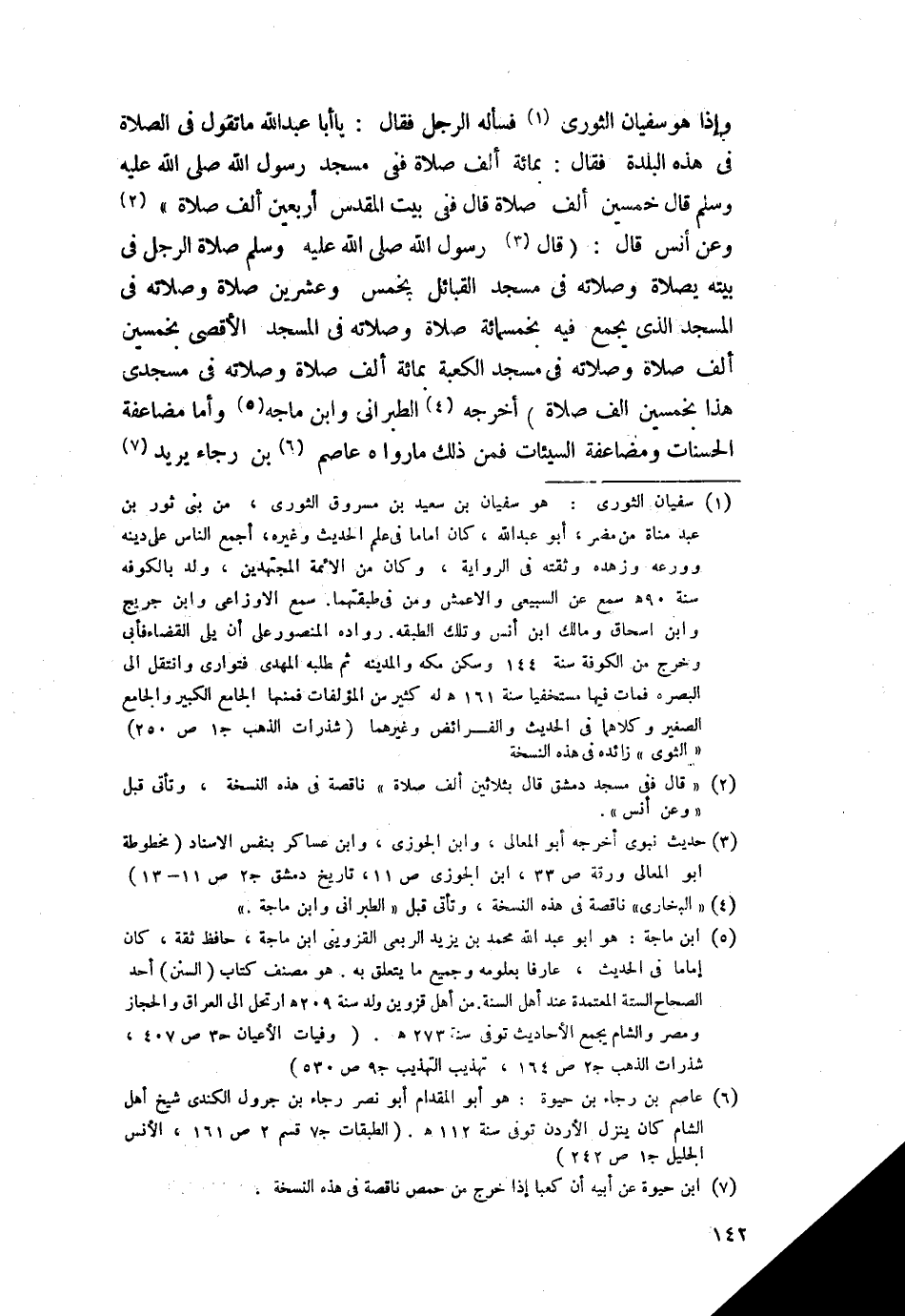 وإذا هو سفيان الثوري فسأله الرجل فقال: يا أبا عبد اللَّه ما تقول في الصلاة في هذه البلدة؟ فقال: بمائة ألف صلاة ففي مسجد رسول اللَّه -صلى اللَّه عليه وسلم-؟ قال خمسين ألف صلاة. قال ففي بيت المقدس أربعين ألف صلاة" وعن أنس قال قال رسول اللَّه -صلى اللَّه عليه وسلم-: "صلاة الرجل في بيته بصلاة وصلاته في مسجد القبائل بخمس وعشرين صلاة وصلاته في المسجد الذي يجمع فيه بخمسمائة صلاة وصلاته في المسجد الأقصى بخمسين ألف صلاة وصلاته في مسجد الكعبة بمائة ألف صلاة وصلاته في مسجدي هذا بخمسين ألف صلاة" أخرجه الطبراني وابن ماجه.