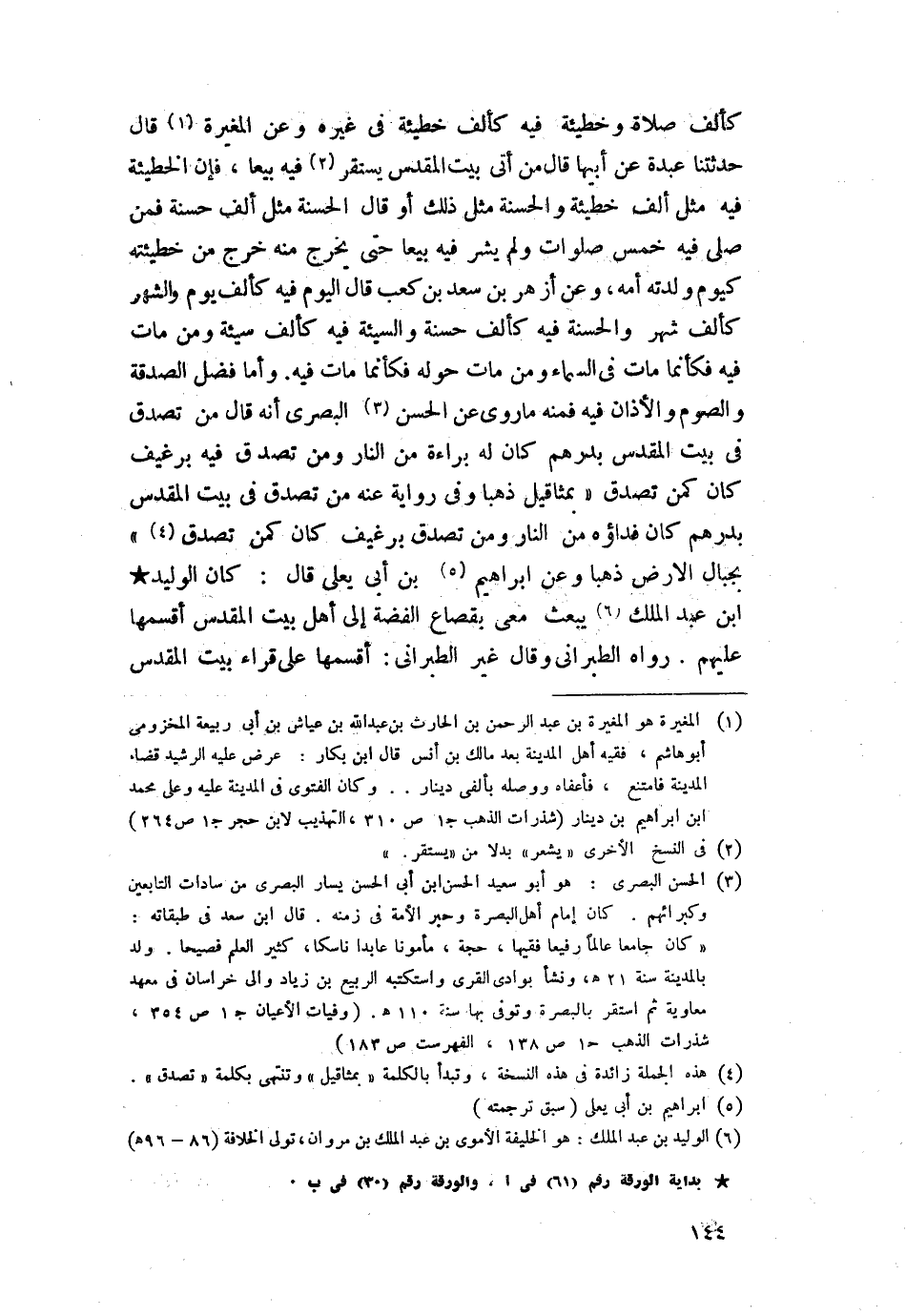 كألف صلاة وخطيئة فيه كألف خطيئة في غيره وعن المغيرة قال حدثتنا عبدة عن أبيها قال: من أتى بيت المقدس يستقر فيه بيعا، فإن الخطيئة فيه مثل ألف خطيئة والحسنة مثل ذلك أو قال الحسنة مثل ألف حسنة فمن صلى فيه خمس صلوات ولم يشر فيه بيعًا حتى يخرج منه خرج من خطيئته كيوم ولدته أمه.