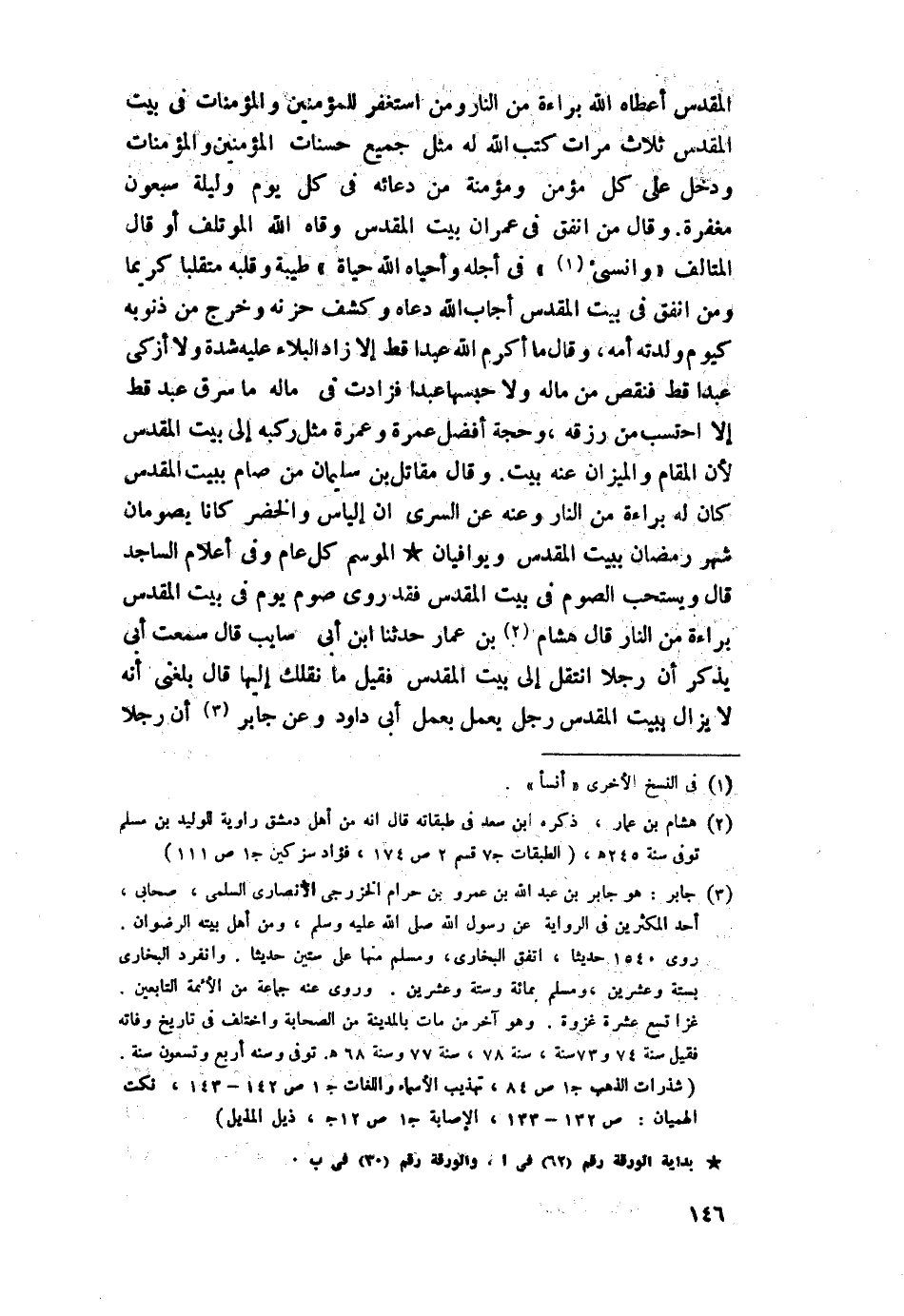 المقدس أعطاه اللَّه براءة من النار، ومن استغفر للمؤمنين والمؤمنات في بيت المقدس ثلاث مرات كتب اللَّه له مثل جميع حسنات المؤمنين والمؤمنات ودخل على كل مؤمن ومؤمنة من دعائه في كل يوم