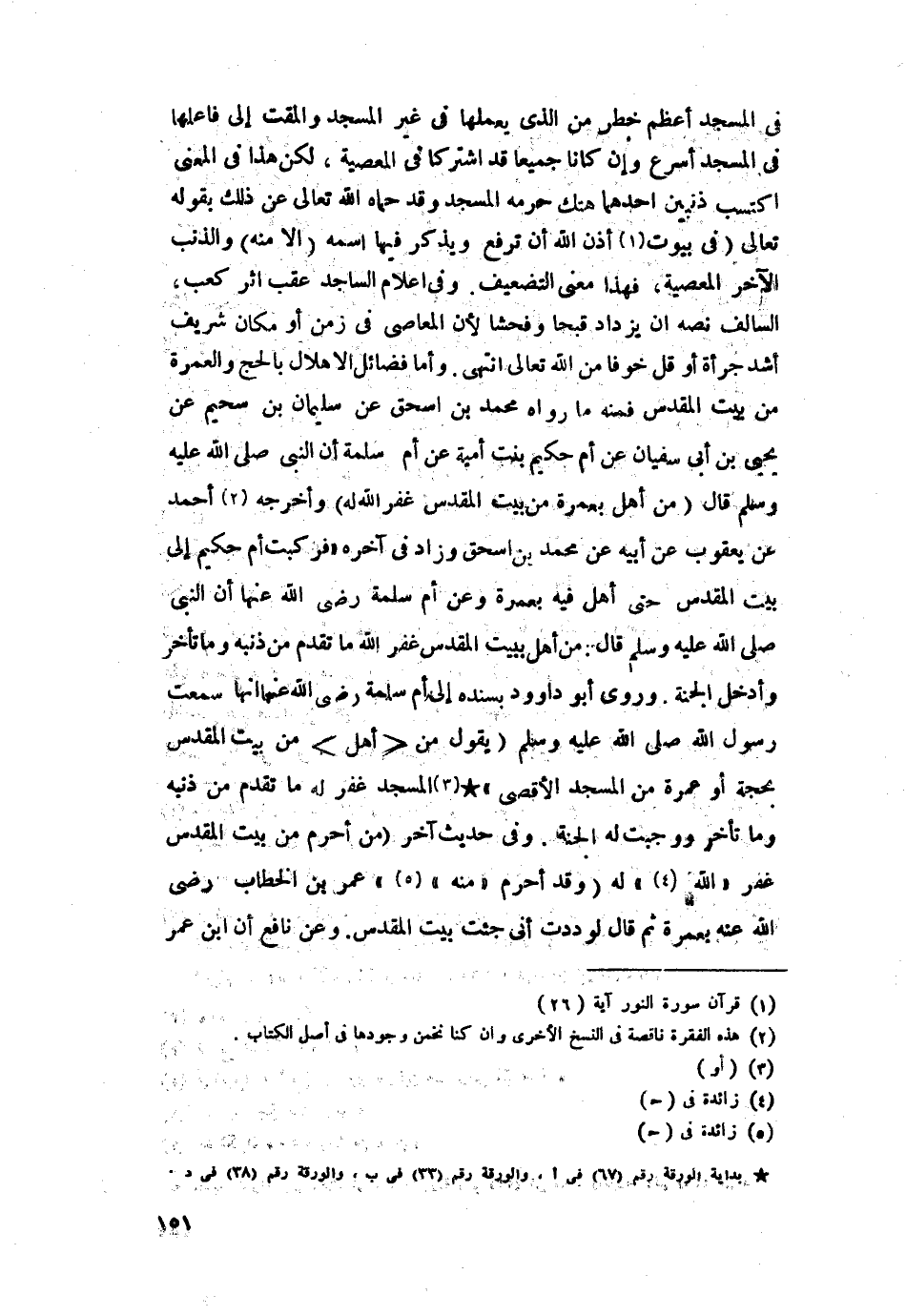 وفي أعلام المساجد عقب أثر كعب السالف نصّه أن يزداد قبحا وفحشا لأن المعاصي في زمن أو مكان شريف أشد جرأة أو أقل خوفا من اللَّه تعالى انتهى. وأما فضائل الإهلال بالحج والعمرة من بيت المقدس فمنه ما رواه محمد بن إسحاق عن سليمان بن سحيم عن يحيى بن أبي سفيان عن أم حكيم بنت أمية عن أم سلمة أن النبي -صلى اللَّه عليه وسلم- قال: "من أهلَّ بعمرة من بيت المقدس غفر اللَّه له" وأخرجه أحمد عن يعقوب عن أبيه عن محمد بن إسحاق وزاد في آخره "فركبت أم حكيم إلى بيت المقدس حتى أهلت منه بعمرة.