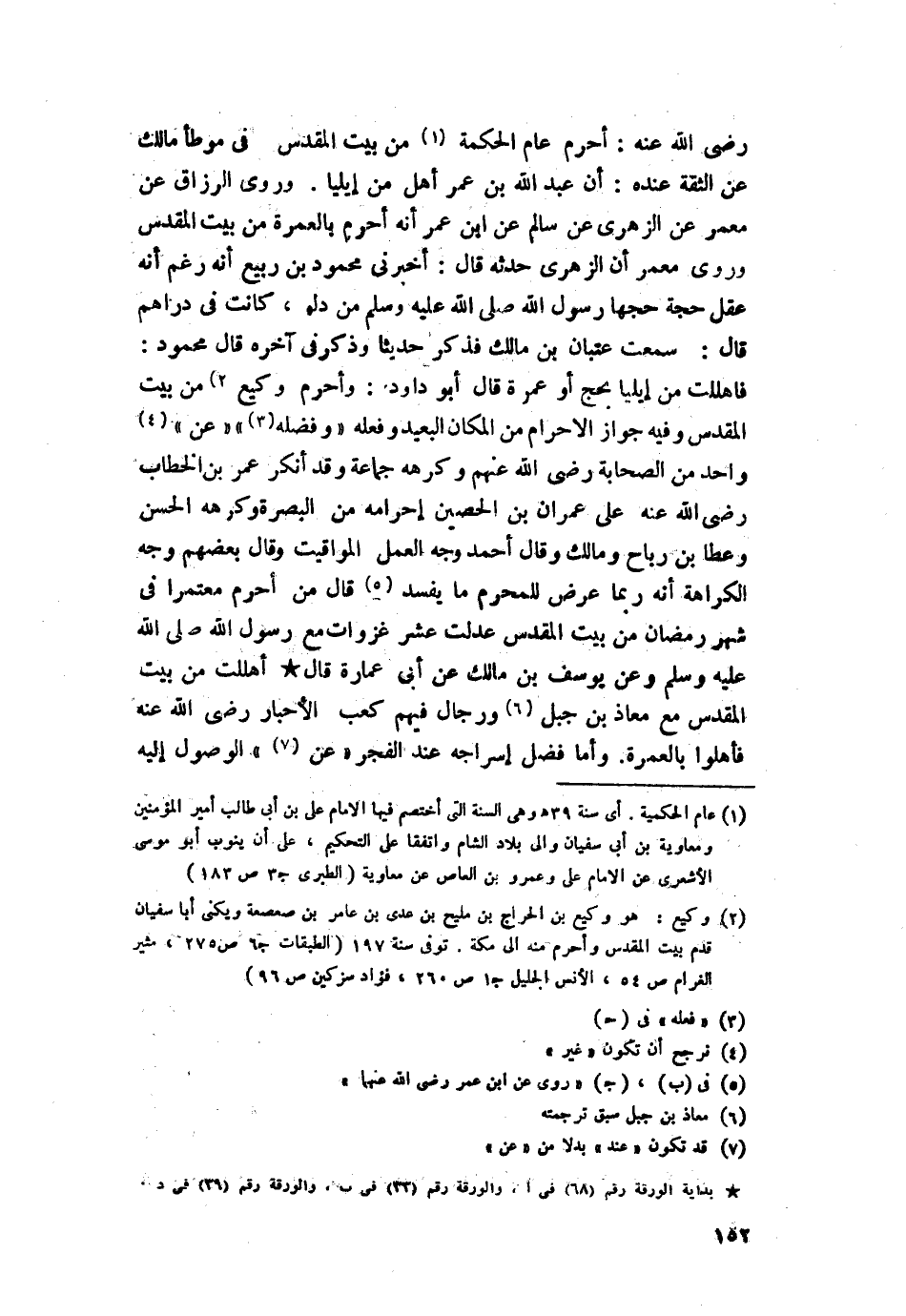 -رضي اللَّه عنه-: أحرم عام الحكمة من بيت المقدس في موطأ مالك عن الثقة عنده: أن عبد اللأه بن عمر أهلَّ من إيلياء. وروى عبد الرزاق عن معمر عن الزهري عن سالم عن ابن عمر أنه أحرم بالعمرة من بيت المقدس وروى معمر أنَّ الزهري حدثه قال: أخبرني محمود بن ربيع أنه رغم أنه عقل حجة حجها رسول اللَّه -صلى اللَّه عليه وسلم-