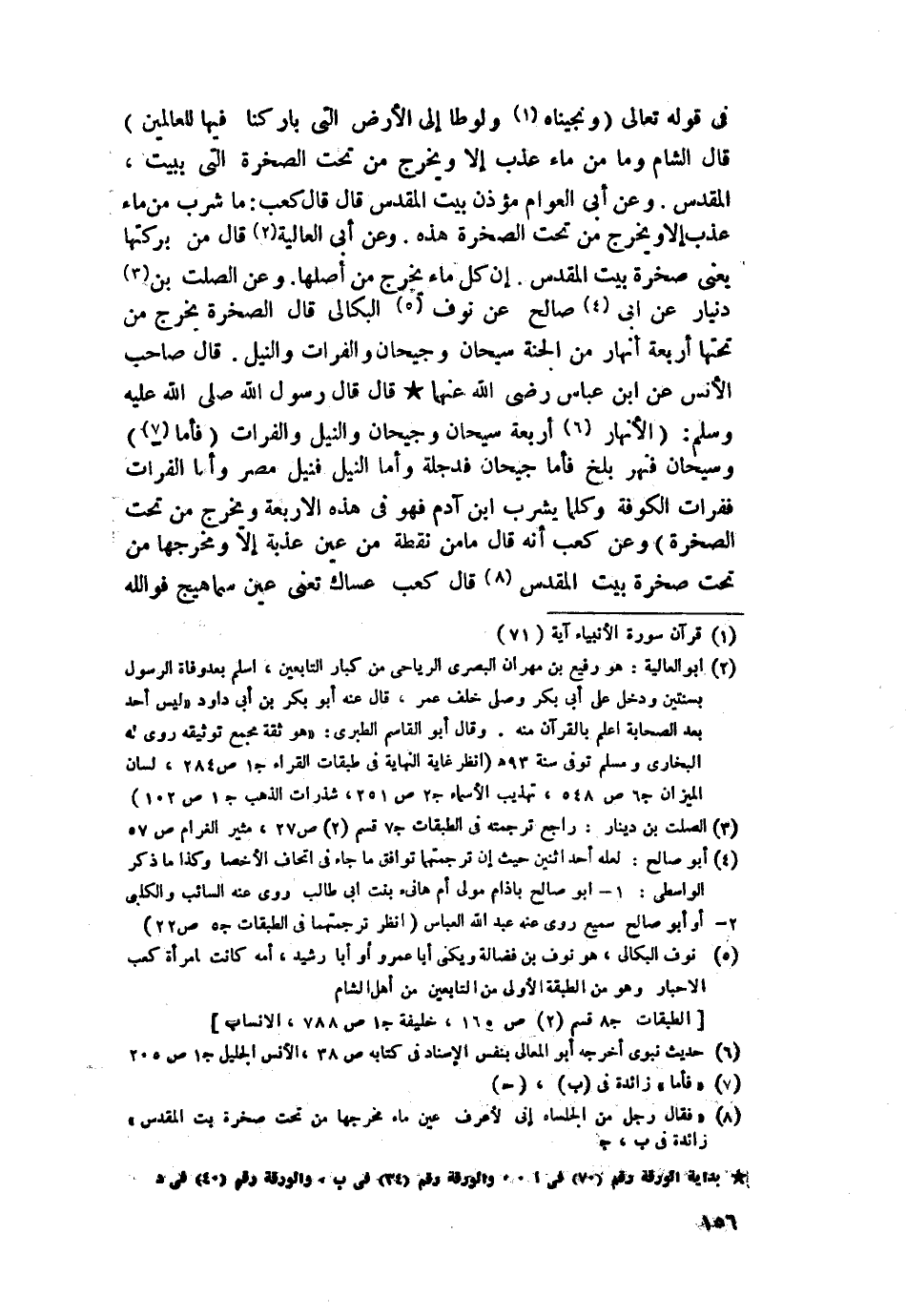في قوله {وَنَجَّيْنَاهُ وَلُوطًا إِلَى الْأَرْضِ الَّتِي بَارَكْنَا فِيهَا لِلْعَالَمِينَ} [الأنبياء: 71] قال: الشام وما من ماء عذب إلا ويخرج من تحت الصخرة التي ببيت المقدس. وعن أبي العوام مؤذن بيت المقدس قال: قال كعب: ما شرب من ماء عذب إلا ويخرج من تحت الصخرة هذه. وعن أبي العالية قال من بركتها -يعني صخرة بيت المقدس- أن كل ماء يخرج من أصلها.