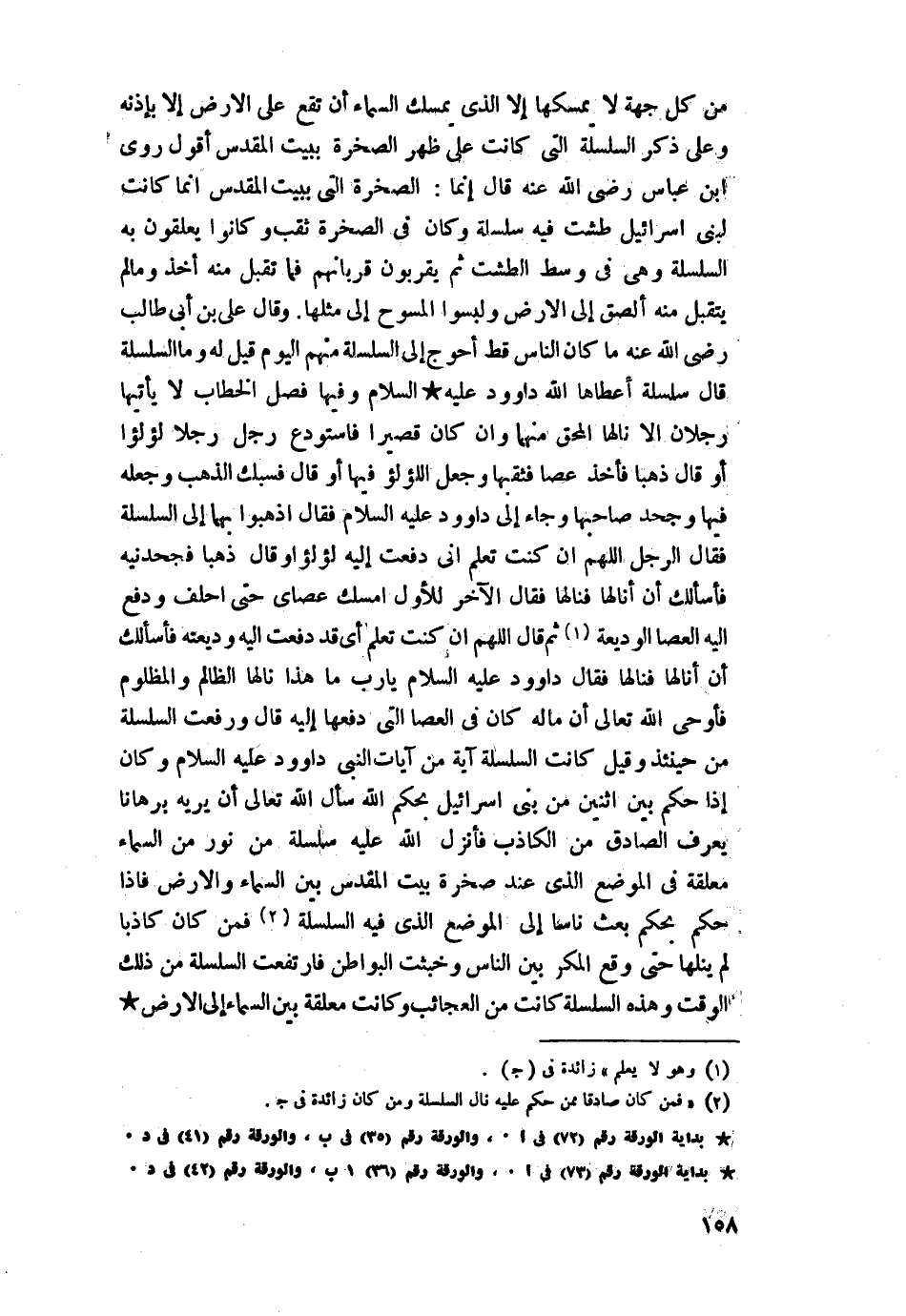 اثنين من بني إسرائيل بحكم اللَّه سأل اللَّه تعالى أن يريه برهانا يعرف الصادق من الكاذب فأنزل اللَّه عليه سلسلة من نور من السماء معلقة في الموضع الذي عند صخرة بيت المقدس بين السماء والأرض فإذا حكم بحكم بعث ناسا إلى الموضع الذي فيه السلسلة فمن كان كاذبا لم ينلها حتى وقع المكر بين الناس وخبثت البواطن فارتفعت السلسلة من ذلك الوقت.