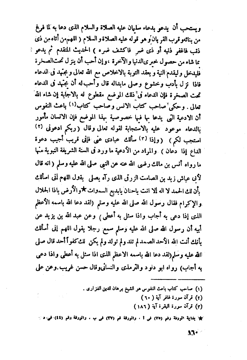 وحكى صاحب كتاب الأنس وصاحب كتاب باعث النفوس أن الأدعية التي يدعو بها فيها خصوصية بهذا الموضع فإن الإنسان مأمور بالدعاء موعود عليه بالاستجابة لقوله تعالى: {وَقَالَ رَبُّكُمُ ادْعُونِي أَسْتَجِبْ لَكُمْ} [غافر: 60]، {وَإِذَا سَأَلَكَ عِبَادِي عَنِّي فَإِنِّي قَرِيبٌ أُجِيبُ دَعْوَةَ الدَّاعِ إِذَا دَعَانِ} [البقرة: 186]، والمراد من الأدعية ما ورد في السنة الشريفة النبوية منها ما رواه أنس بن مالك -رضي اللَّه عنه- عن النبي -صلى اللَّه عليه وسلم- "أنه قال لأبي عياش زيد بن الصامت الزرقي الذي رآه يصلي يقول: اللهم إني أسألك بأن لك الحمد لا إله إلا أنت يا حنان يا بديع السموات والأرض يا ذا الجلال والإكرام فقال رسول اللَّه -صلى اللَّه عليه وسلم- لقد دعا اللَّه باسمه الأعظم الذي إذا دعى به أجاب وإذا سئل به أعطى".