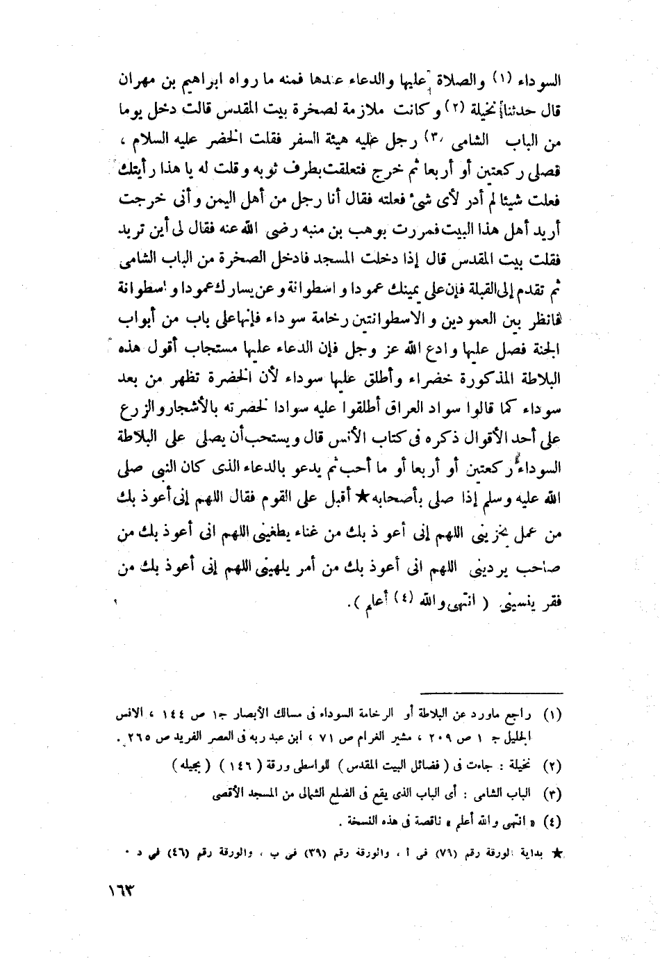 السوداء والصلاة عليها والدعاء عندها فمنه ما رواه إبراهيم بن مهران، قال: حدثنا نخيلة وكانت ملازمة لصخرة بيت المقدس قالت: دخل يوما من الباب الشامي رجل عليه هيئة السفر فقلت الخضر عليه السلام، فصلى ركعتين أو أربعا ثم خرج فتعلقت بطرف ثوبه وقلت له يا هذا رأيتك فعلت شيئًا لم أدر لأي شيء فعلته فقال: أنا رجل من أهل اليمن وإني خرجت أريد أهل هذا البيت فمررت بوهب بن منبه -رضي اللَّه عنه- فقال لي: "أين تريد؟ فقلت: بيت المقدس قال: إذا دخلت المسجد فادخل الصخرة من الباب الشامى ثم تقدم إلى القبلة فإن على يمينك عمودًا وإسطوانة وعن يسارك عمومًا وإسطوانة فانظر بين العمودين والإسطوانتين رخامة سوداء فإنها على باب من أبواب الجنة فصل عليها وادع اللَّه عز وجل فإن الدعاء عليها مستجاب" أقول هذه البلاطة المذكورة خضراء.