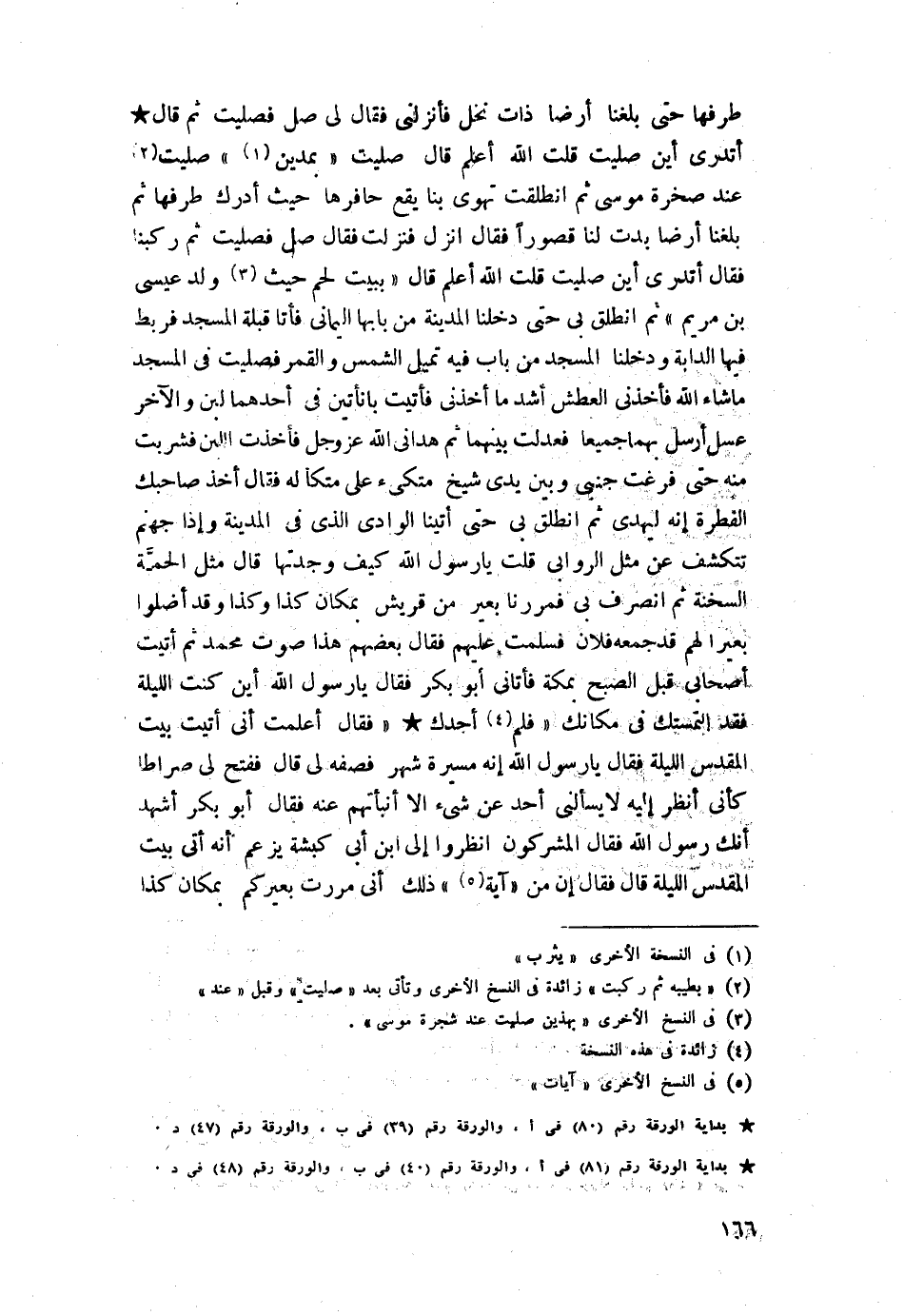 طرفها حتى بلغنا أرضًا ذات نخل فأنزلني. فقال لي صلِّ فصليت، ثم قال: أتدري أين صليت؟ قلت: اللَّه أعلم قال: صليت بمدين ثم صليت بطيبة، ثم ركبت عند صخرة موسى، ثم انطلقت تهوي بنا يقع حافرها حيث أدرك طرفها ثم بلغنا أرضا بدت لنا قصورًا فقال: انزل فنزلت فقال: صلِّ فصليتا، ثم ركبنا فقال: أتدري أين صليت؟ قلت اللَّه أعلم قال "ببيت لحم حيث ولد عيسى ابن مريم، ثم انطلق بي حتى دخلنا المدينة من بابها اليماني وأتى قبلة المسجد فربط فيها الدابة، ودخلنا المسجد من باب فيه تميل الشمس والقمر فصليت في المسجد ما شاء اللَّه فأخذني العطش أشد ما أخذني فأتيت بإناءين في أحداهما لبن والآخر عسل أرسل بهما جميعا فعدلت بينهما ثم