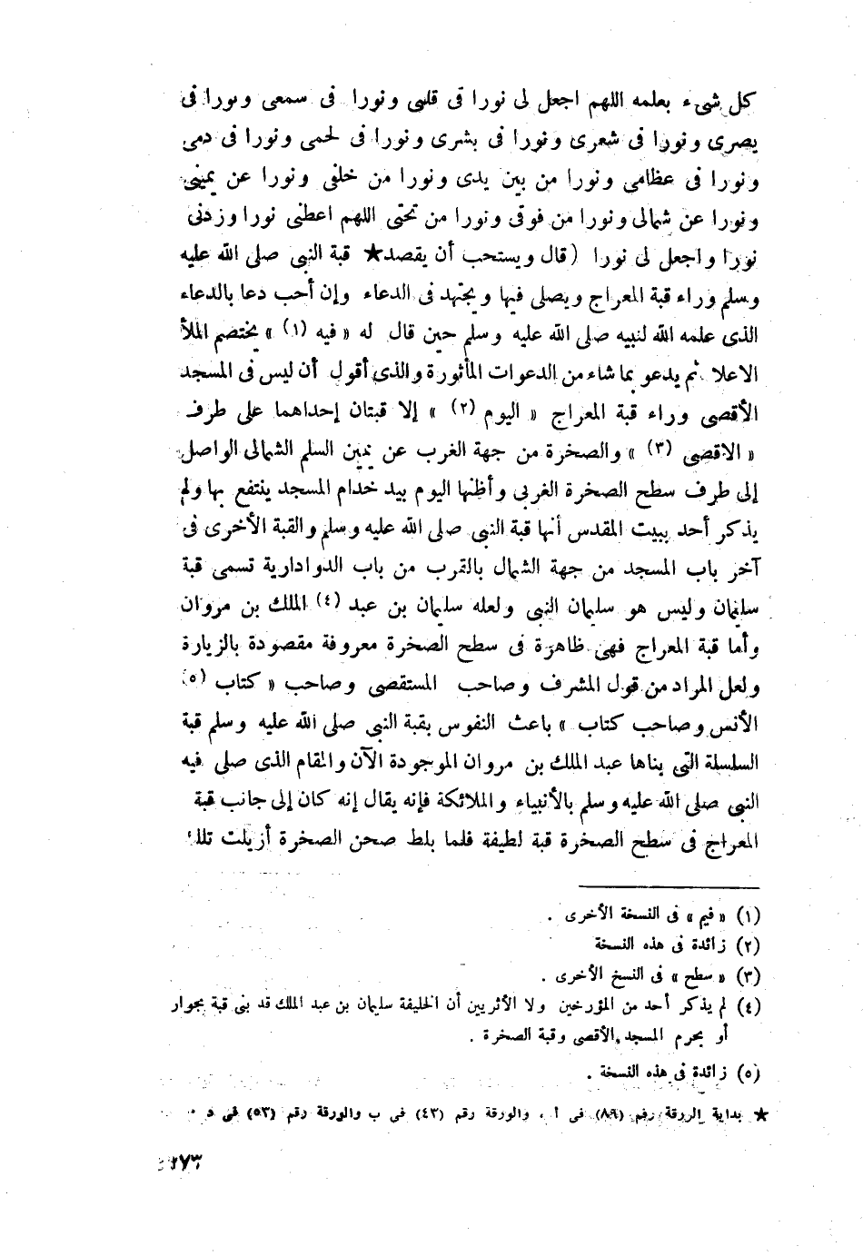 والذي أقول: إنه ليس في المسجد الأقصى وراء قبة المعراج اليوم إلا قبتان إحداهما على طرف الأقصى والصخرة من جهة الغرب عن يمين السلم الشمالي الواصل إلى طرف سطح الصخرة الغربي وأظنها اليوم بيد خدام المسجد ينتفع بها ولم يذكر أحد ببيت المقدس أنها قبة النبي -صلى اللَّه عليه وسلم- والقبة الأخرى في آخر باب المسجد من جهة الشمال بالقرب من باب الدوادارية تسمى قبة سليمان وليس هو سليمان النبي ولعله سليمان بن عبد الملك بن مروان، وأما قبة المعراج فهي ظاهرة في سطح الصخرة معروفة مقصودة بالزيارة، ولعل المراد من قول المشرف وصاحب المستقصى وصاحب كتاب الأنس وصاحب كتاب باعث النفوس بقبة النبي -صلى اللَّه عليه وسلم- قبة السلسلة التي بناها عبد الملك بن مروان الموجودة الآن، والمقام الذي صلى فيه النبي -صلى اللَّه عليه وسلم- بالأنبياء والملائكة فإنه يقال إنه كان إلى جانب قبة المعراج في سطح الصخرة قبة لطيفة فلما بلط صحن الصخرة أزيلت تلك