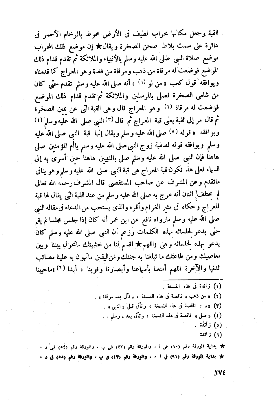 القبة وجعل مكانها محراب لطيف في الأرض محوط بالرخام الأحمر في دائرة على سمت بلاط صحن الصخرة، ويقال إن موضع ذلك المحراب موضع صلاة النبي -صلى اللَّه عليه وسلم- بالأنبياء والملائكة ثم تقدم قدام ذلك الموضع فوضعت له مرقاة من ذهب ومرقاة من فضة وهو المعراج كما قدمناه، ويوافقه قول كعب من أنه -صلى اللَّه عليه وسلم- تقدم حتى كان من شامي الصخرة فصلى بالمرسلين والملائكة ثم تقدم قدام ذلك الموضع فوضعت له مرقاة من ذهب وهو المعراج قال وهى القبة التي عن يمين الصخرة ثم قال مر إلى القبة يعني قبة المعراج، ويوافقه قوله لصفية زوج النبي -صلى اللَّه عليه وسلم- يا أم المؤمنين صلِّ ههنا فإن النبي -صلى اللَّه عليه وسلم- صلى بالنبيين ههنا حين أسري به إلى السماء، فعلى هذا تكون قبة المعراج هي قبة النبي -صلى اللَّه عليه وسلم- وهو ينافي ما تقدم، وعن المشرف عن صاحب المستقصى قال المشرف رحمه اللَّه تعالى لم يختلف اثنان أنه عرج به -صلى اللَّه عليه وسلم- من عند القبة