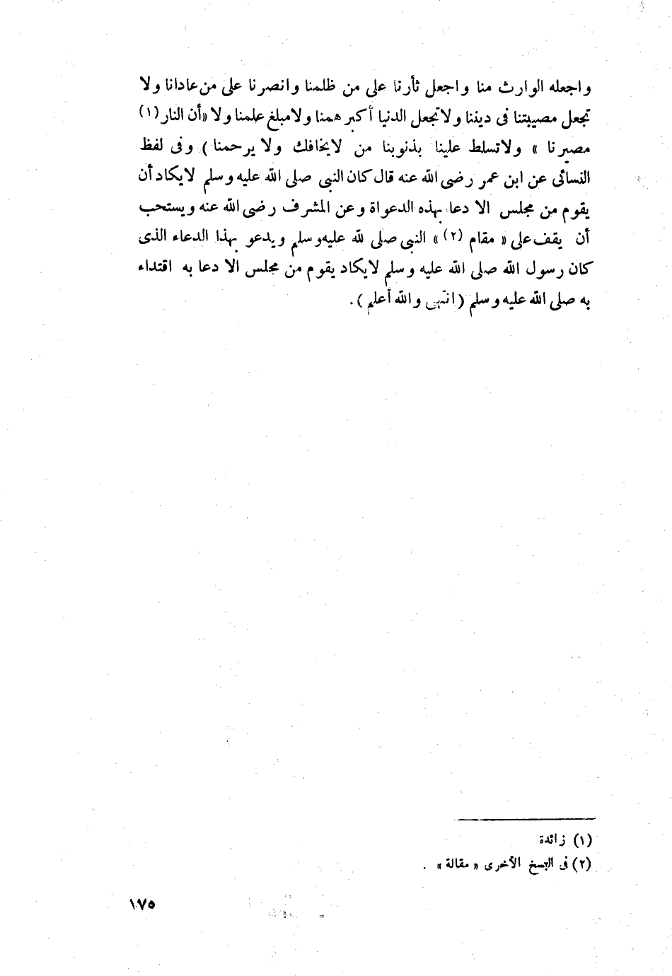 وفي لفظ النسائي عن ابن عمر -رضي اللَّه عنه- قال: كان النبي -صلى اللَّه عليه وسلم- لا يكاد أن يقوم من مجلس إلا دعا بهذه الدعوات وعن المشرف -رضي اللَّه عنه- ويستحب أن يقف على مقام النبي -صلى اللَّه عليه وسلم- ويدعو بهذا الدعاء الذي كان رسول اللَّه -صلى اللَّه عليه وسلم- لا يكاد يقوم من مجلس إلا دعا به اقتداء به -صلى اللَّه عليه وسلم- (انتهى واللَّه أعلم).