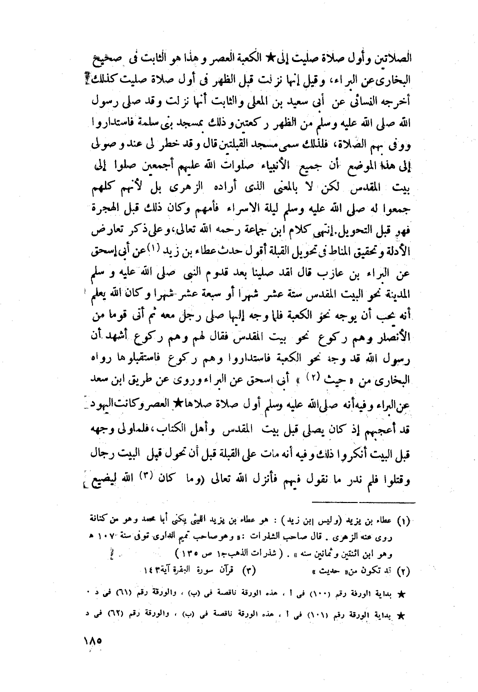 وعلى ذكر تعارض الأدلة وتحقيق المناط في تحويل القبلة أقول حدث عطاء بن زيد عن أبي إسحاق عن البراء بن عازب، قال: لقد صلينا بعد قدوم النبي -صلى اللَّه عليه وسلم- المدينة نحو البيت المقدس ستة عشر شهرًا أو سبعة عشر شهرًا وكان اللَّه يعلم أنه يحب أن يوجه نحو الكعبة فلما وجه إليها صلى رجل معه ثم أتى قوما من الأنصار وهم ركوع: نحو بيت المقدس فقال لهم وهم ركوع أشهد أن رسول اللَّه قد وجه نحو الكعبة فاستداروا وهم ركوع فاستقبلوها رواه البخاري من حديث أبى إسحاق عن البراء، وروى عن طريق ابن سعد عن البراء وفيه أنه -صلى اللَّه عليه وسلم- أول صلاة صلاها العصر وكانت اليهود قد أعجبهم إذ كان يصلى قبل بيت المقدس وأهل الكتاب، فلما ولى وجهه قبل البيت أنكروا ذلك وفيه أنه مات على القبلة قبل أن دخول قبل البيت رجال وقتلوا فلم