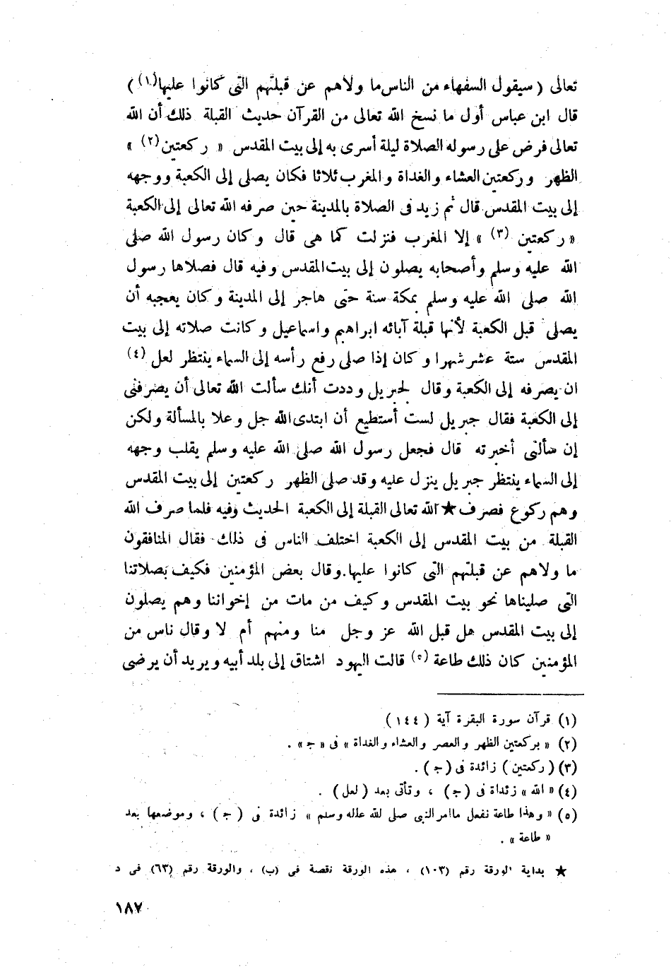 وفيه قال فصلاها رسول اللَّه -صلى اللَّه عليه وسلم- بمكة سنة، حتى هاجر إلى المدينة وكان يعجبه أن يصلي قِبَل الكعبة: لأنها قبلة آبائه إبراهيم وإسماعيل وكانت صلاته إلى بيت المقدس ستة عشر شهرا وكان إذا صلى رفع رأسه إلى السماء ينتظر لعل أن يصرفه إلى الكعبة وقال لجبريل: وددت أنك سألت اللَّه تعالى أن يصرفني إلى الكعبة فقال جبريل لست أستطيع أن أبتدئ اللَّه جل وعلا بالمسألة، ولكن إن سألني أخبرته قال فجعل رسول اللَّه -صلى اللَّه عليه وسلم- يقلب وجهه إلى السماء ينتظر جبريل ينزل عليه وقد صلى الظهر ركعتين الى بيت المقدس وهم ركوع فصرف اللَّه تعالى القبلة إلى الكعبة الحديث وفيه فلما صرف اللَّه القبلة من بيت المقدس إلى الكعبة اختلف الناس في ذلك فقال المنافقون: ما ولاهم عن قبلتهم التي كانوا عليها. وقال بعض المؤمنين: فكيف بصلاتنا التي صليناها نحو بيت المقدس وكيف من مات من إخواننا وهم يصلون إلى بيت المقدس، هل قبل اللَّه عز وجل منا ومنهم أم لا؟ وقال ناس من المؤمنين كان ذلك طاعة، قالت اليهود: اشتاق إلى بلد أبيه ويريد أن يرضي
