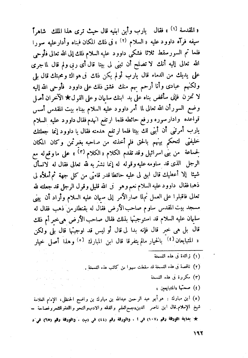 وقد تقدم الكلام على ما وقع له مع الرجل الذي قد ساومه عليه وقوله له إنما نشتريه للَّه تعالى فقال له لا تسأل شيئًا إلا أعطيك قال ابن لي عليه حائطًا قدر قامتي من كل جهة ثم املأه لى ذهبا، فقال داود عليه السلام نعم وهو في اللَّه قليل، وقول الرجل قد جعلته للَّه تعالى فأقبلوا على العمل ثم لما صار الأمر إلى سليمان عليه السلام وأراد أن يبنى مسجد بيت المقدس ساوم صاحب الأرض. فقال له: بقنطار من ذهب فقال له سليمان عليه السلام: قد استوجبتها بذلك فقال صاحب الأرض: هي خير أم ذلك قال: بل هي خير قال فإنه بدا لى قال: أو ليس قد أوجبتها قال بلى ولكن المتبايعين بالخيار ما لم يتفرقا قال ابن المبارك وهذا أصل خيار