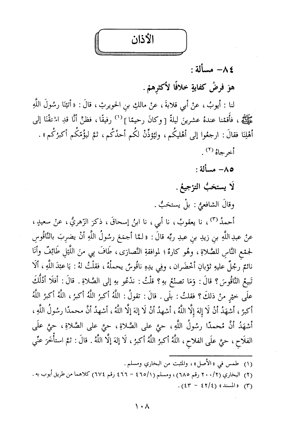 لنا: أيوبُ عَن أبي قلابةَ، عَن مَالك بن الْحُوَيْرِث، قَالَ: " أَتَيْنَا رَسُول الله [صلى الله عَلَيْهِ وَسلم] ، فَأَقَمْنَا عِنْده عشْرين لَيْلَة [وَكَانَ رحِيما] رَفِيقًا، فَظن أَنا قد اشتقنا إِلَى أهلنا فَقَالَ: ارْجعُوا إِلَى أهليكم، وليؤذن لكم أحدكُم، ثمَّ ليؤمكم أكبركم ".
