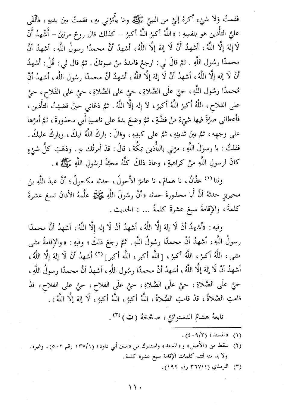وَفِيه: " أشهد أَن لَا إِلَه إِلَّا الله، أشهد أَن لَا إِلَه إِلَّا الله، أشهد أَن مُحَمَّدًا رَسُول الله، أشهد أَن مُحَمَّدًا رَسُول الله. ثمَّ رَجَعَ ذَلِك " وَفِيه: " وَالْإِقَامَة مثنى مثنى، الله أكبر، الله أكبر، [الله أكبر، الله أكبر] أشهد أَن لَا إِلَه إِلَّا الله، أشهد أَن لَا إِلَه إِلَّا الله، أشهد أَن مُحَمَّدًا رَسُول الله، أشهد أَن مُحَمَّدًا رَسُول الله، حيّ على الصَّلَاة، حيّ على الصَّلَاة، حيّ على الْفَلاح، حيّ على الْفَلاح، قد قَامَت الصَّلَاة، قد قَامَت الصَّلَاة، الله أكبر، الله أكبر، لَا إِلَه إِلَّا الله ".