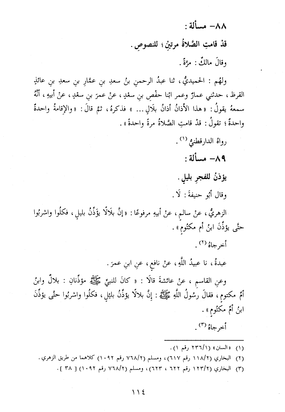 وَلَهُم: الْحميدِي، ثَنَا عبد الرَّحْمَن بن سعد بن عمار بن سعد بن عَائِذ الْقرظ، حَدثنِي عمار وَعمر ابْنا حَفْص بن سعد، عَن عمر بن سعد، عَن أَبِيه، أَنه سَمعه يَقُول: " هَذَا الْأَذَان أَذَان بِلَال ... " فَذكره، ثمَّ قَالَ: " وَالْإِقَامَة واحدةٌ واحدةٌ؛ تَقول: قد قَامَت الصَّلَاة مرّة وَاحِدَة ".