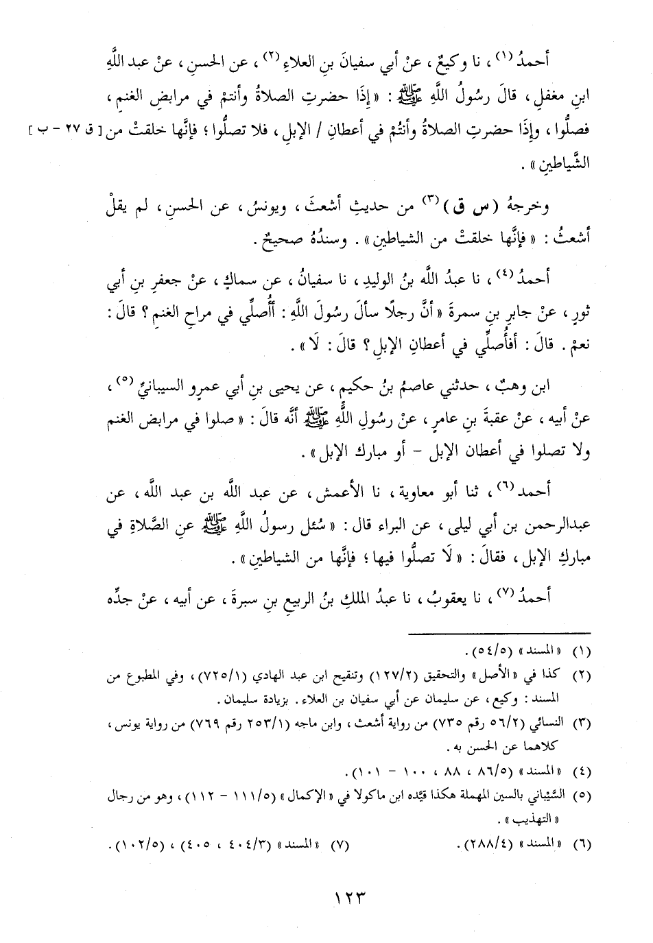 أَحْمد، ثَنَا أَبُو مُعَاوِيَة، نَا الْأَعْمَش، عَن عبد الله بن عبد الله، عَن عبد الرَّحْمَن بن أبي ليلى، عَن الْبَراء قَالَ: " سُئل رسولُ الله [صلى الله عَلَيْهِ وَسلم] عنِ الصلاةِ فِي مبارك الْإِبِل، فَقَالَ: " لَا تصلوا فِيهَا؛ فإنَّها من الشياطينِ ".