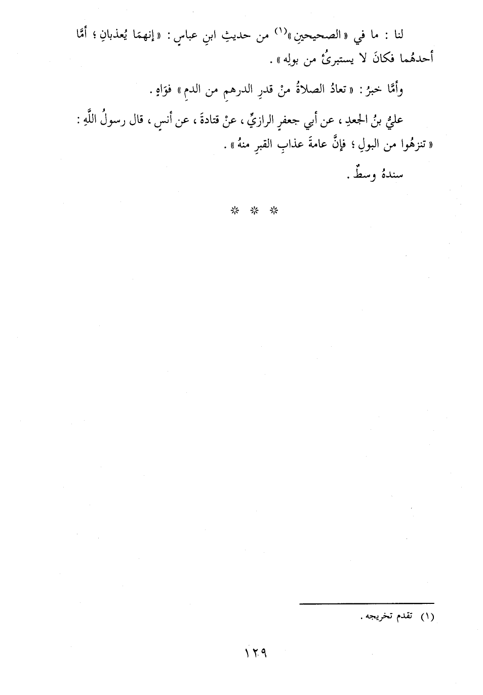 لنا: مَا فِي " الصَّحِيحَيْنِ " من حَدِيث ابْن عَبَّاس: " إنَّهُمَا يُعذبانِ؛ أمَّا أحدُهما فكانَ لَا يستبرئُ من بولِه ".