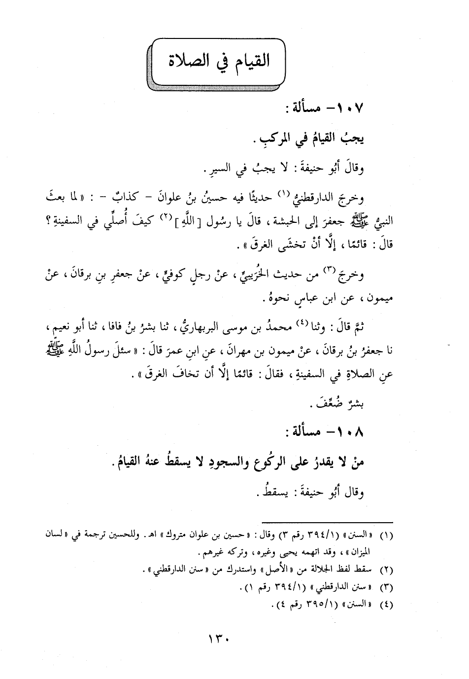 وَخرج الدَّارقطنيُّ حَدِيثا فِيهِ حسينُ بن علوان - كَذَّاب -: " لما بعثَ النَّبِي [صلى الله عَلَيْهِ وَسلم] جَعْفَر إِلَى الْحَبَشَة، قَالَ يَا رَسُول [الله] كَيفَ أُصَلِّي فِي السَّفِينَة؟ قالَ: قَائِما، إِلَّا أَن تخشى الغرقَ ".