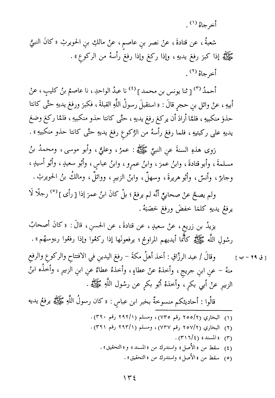 شعبةُ، عَن قتادةَ، عَن نصر بن عَاصِم، عَن مَالك بن الْحُوَيْرِث " كَانَ النبيُّ [صلى الله عَلَيْهِ وَسلم] إِذا كبرَ رفعَ يديهِ، وَإِذا ركعَ وَإِذا رفع رَأسه من الرُّكُوع ".