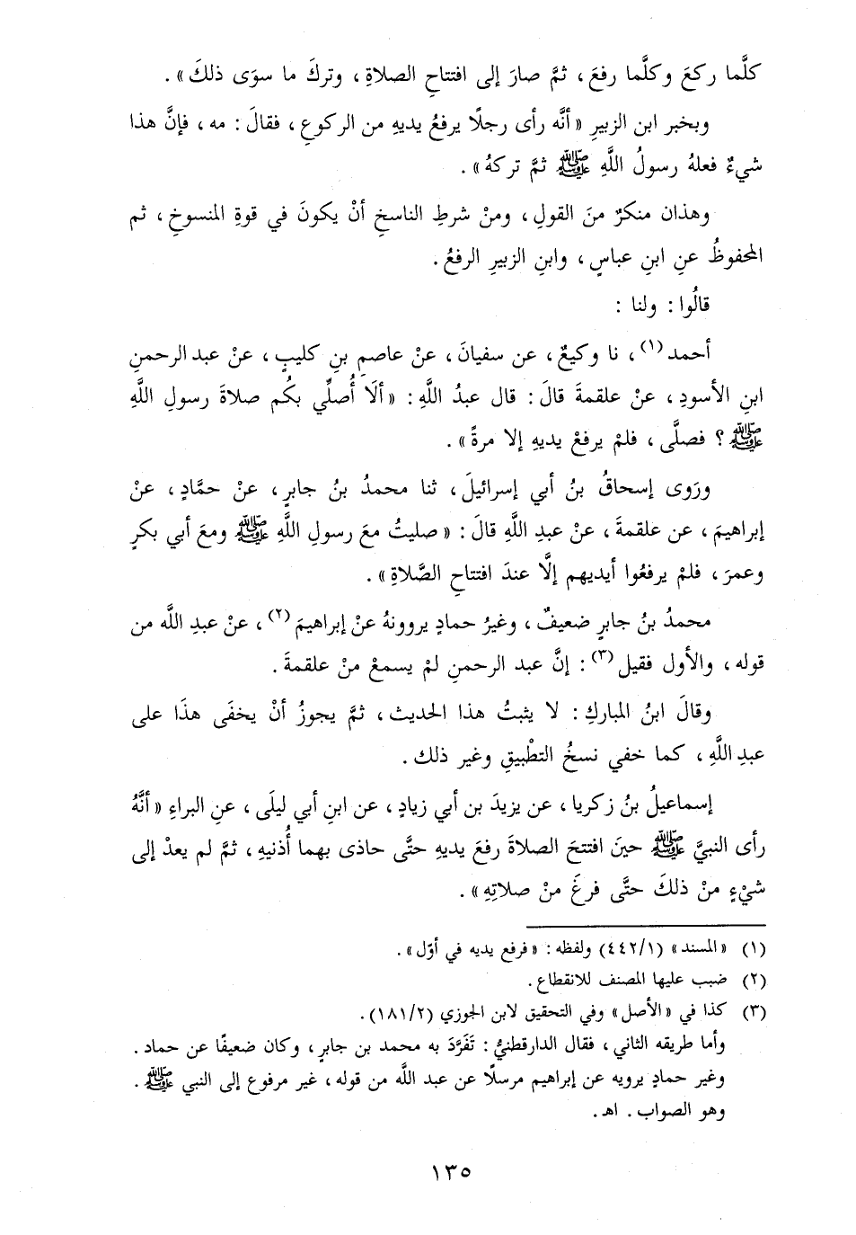 ورَوى إسحاقُ بنُ أبي إسرائيلَ، ثَنَا مُحَمَّد بن جَابر، عَن حَمَّاد، عَن إِبْرَاهِيم، عَن عَلْقَمَة، عَن عبد الله قَالَ: " صليتُ مَعَ رَسُول الله [صلى الله عَلَيْهِ وَسلم] وَمَعَ أبي بكر وعمرَ، فَلم يرفعُوا أَيْديهم إلاَّ عندَ افْتِتَاح الصلاةِ ".