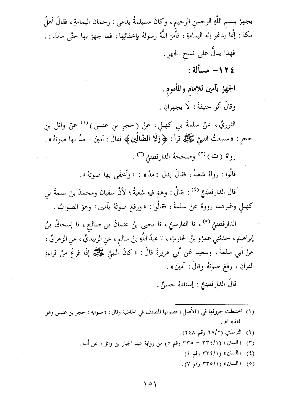 الثَّوْريّ، عَن سلمةَ بن كهيلٍ، عَن (حجرِ بن عَنْبَس) عَن وَائِل بن حجرٍ: " سَمِعت النَّبِي [صلى الله عَلَيْهِ وَسلم] قَرَأَ: {وَلَا الضَّالّين} فقالَ: آمين - مدَّ بهَا صوتهُ ".