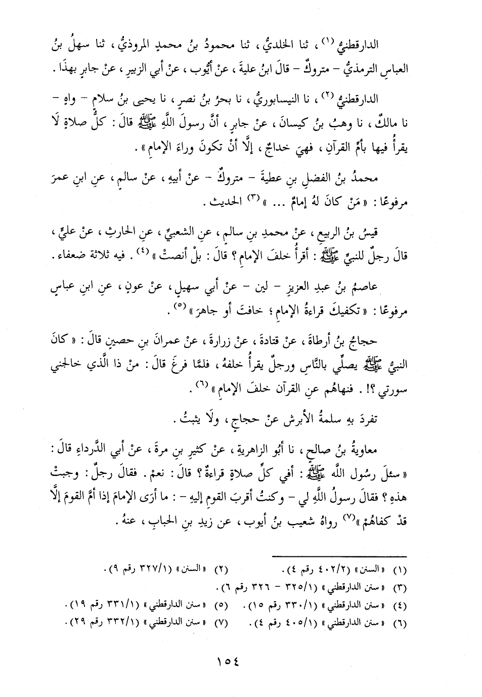 الدَّارقطنيُّ، نَا النَّيْسَابُورِي، نَا بحرُ بنُ نصر، نَا يحيى بنُ سَلام - واهٍ - نَا مَالك، نَا وهب بن كيسانَ، عَن جَابر، أَن رسولَ الله [صلى الله عَلَيْهِ وَسلم] قَالَ: كل صلاةٍ لاَ يقرأُ فِيهَا بِأم القرآنِ، فَهِيَ خداجٌ، إِلَّا أَن تكونَ وَرَاء الإمامِ ".