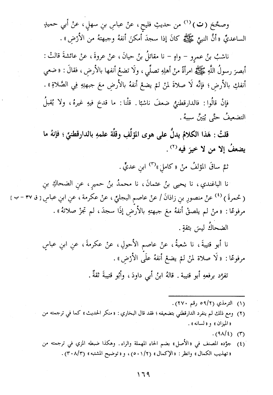 وصحَّح (ت) من حَدِيث فليح، عَن عَبَّاس بن سهلٍ، عَن أبي حميدٍ السَّاعِدِيّ " أَن النَّبِي [صلى الله عَلَيْهِ وَسلم] كانَ إِذا سجدَ أمكنَ أنفهُ وجبهتهُ من الأرضِ ".
