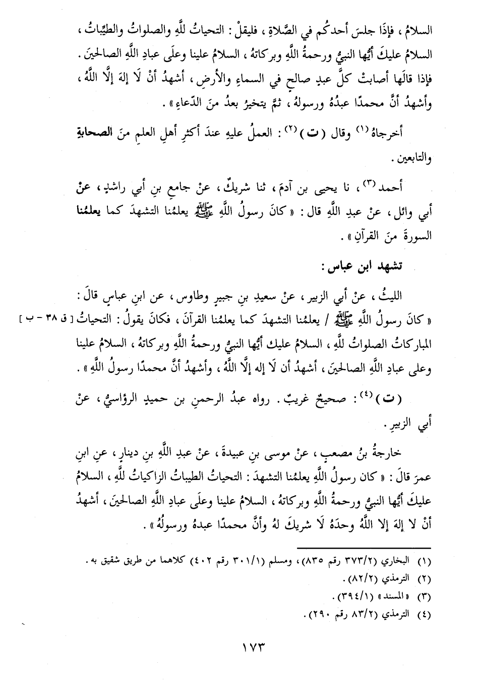 الليثُ، عَن أبي الزبير، عَن سعيد بن جُبَير وَطَاوُس، عَن ابْن عَبَّاس قَالَ: " كَانَ رَسُول الله [صلى الله عَلَيْهِ وَسلم] [ق 38 - ب] / يعلمنَا التشهدَ كَمَا يعلمُنا القرآنَ، فكانَ يقولُ: التَّحِيَّات المباركاتُ الصلواتُ للهِ، السلامُ عَلَيْك أَيهَا النَّبِي ورحمةُ اللهِ وبركاتهُ، السلامُ علينا وعَلى عبادِ اللهِ الصالحينَ، أشهدُ أَن لَا إِلَه إِلَّا الله، وَأشْهد أنَّ مُحَمَّدًا رسولُ الله ".