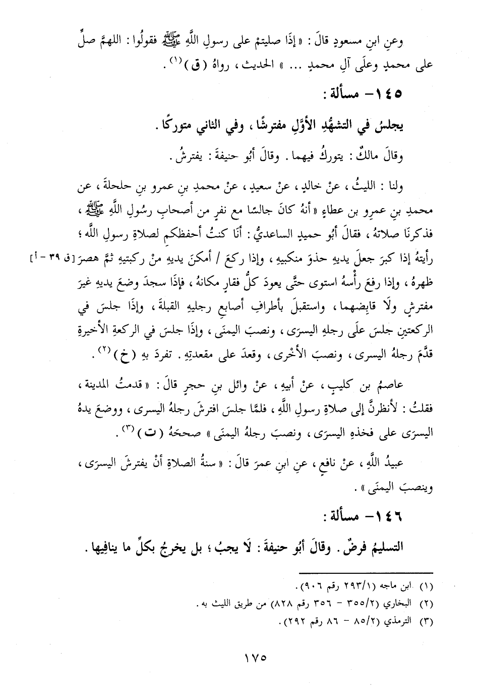 عاصمُ بن كُلَيْب، عَن أَبِيه، عَن وَائِل بن حجر قَالَ: " قدمتُ الْمَدِينَة، فقلتُ: لأنظرنَّ إِلَى صلاةِ رسولِ اللهِ، فَلَمَّا جلسَ افترشَ رجله الْيُسْرَى، وَوضع يَده الْيُسْرَى على فَخذه الْيُسْرَى، وَنصب رجله الْيُمْنَى " صَححهُ (ت) .