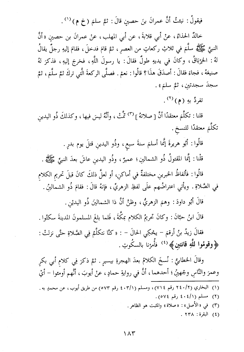 قَالُوا: فألفاظ الْخَبَرَيْنِ مُخْتَلفَة فِي أَمَاكِن، أَو لَعَلَّ ذَلِك كَانَ قبل تَحْرِيم الْكَلَام فِي الصَّلَاة. وَيَأْتِي اعتراضهم على لفظ الزُّهْرِيّ، فَإِنَّهُ قَالَ: فَقَامَ ذُو الشمالين.