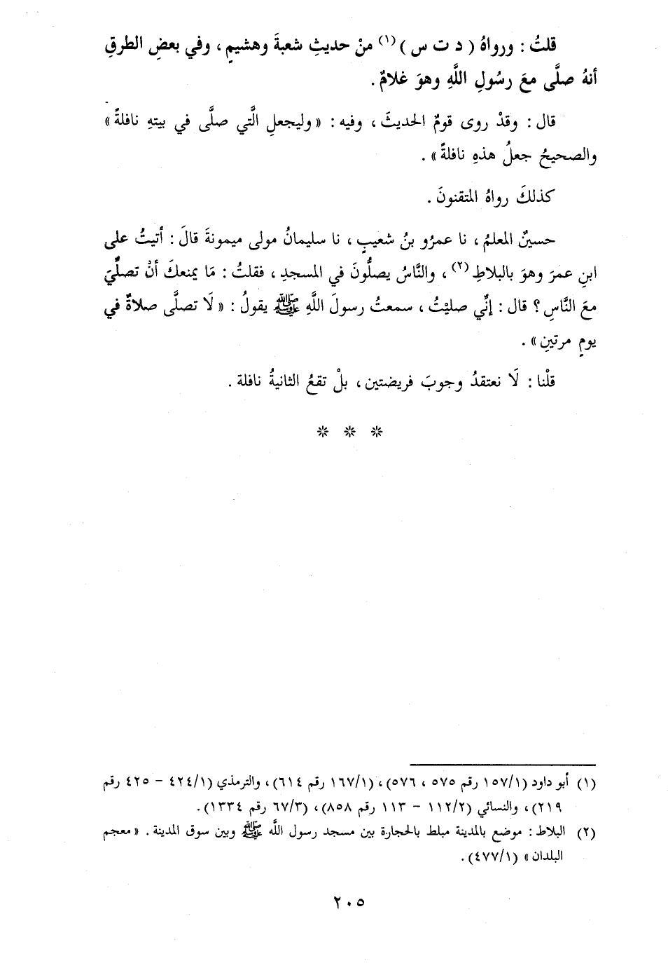 حسينٌ الْمعلم، نَا عَمْرو بن شُعَيْب، نَا سُلَيْمَان مولى مَيْمُونَة قَالَ: أتيت على ابْن عمر وَهُوَ بالبلاط، وَالنَّاس يصلُّونَ فِي المسجدِ، فقلتُ: مَا يمنعكَ أَنِّي تصلِّيَ مَعَ النَّاسِ؟ قَالَ: إنِّ صليْتُ، سمعتُ رسولَ الله [صلى الله عَلَيْهِ وَسلم] يقولُ: " لاَ تصلَّى صلاةٌ فِي يومٍ مرتينِ ".