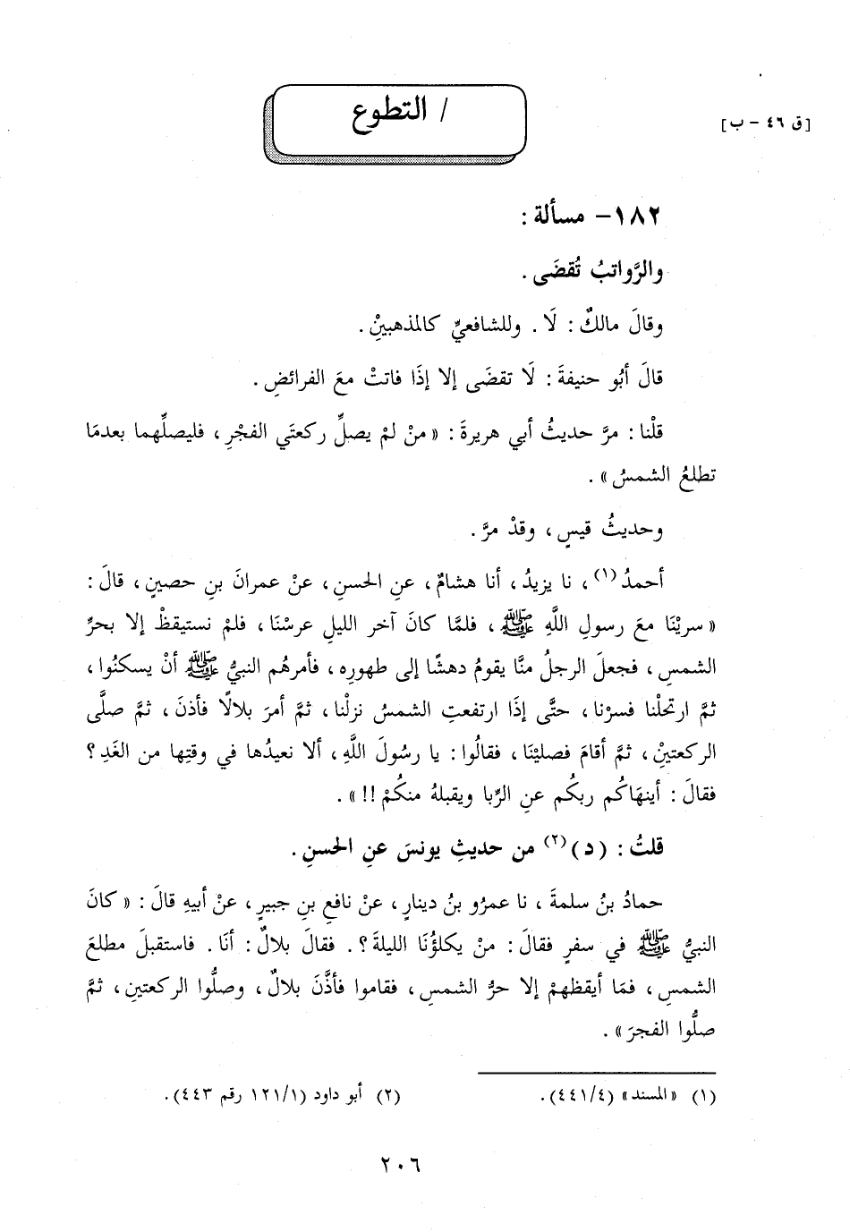 حَمَّاد بن سَلمَة، نَا عَمْرو بن دِينَار، عَن نَافِع بن جُبَير، عَن أَبِيه قَالَ: " كَانَ النَّبِي [صلى الله عَلَيْهِ وَسلم] فِي سفرٍ فَقَالَ: منْ يكلؤُنَا اللَّيْلَة؟ . فَقَالَ بِلَال: أَنا. فاستقبلَ مطلعَ الشمسِ، فَمَا أيقظهم إِلَّا حرُّ الشَّمْس، فَقَامُوا فأذَّنَ بلالٌ، وصلُّوا الرَّكْعَتَيْنِ، ثمَّ صلُّوا الفجرَ ".