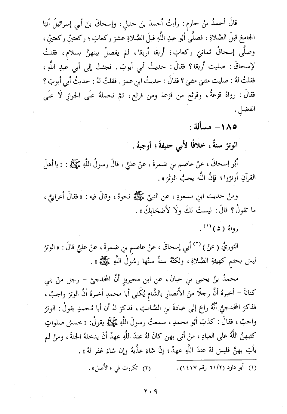 الوترُ سنةٌ، خلافًا لأبي حنيفةَ؛ أوجبهُ.